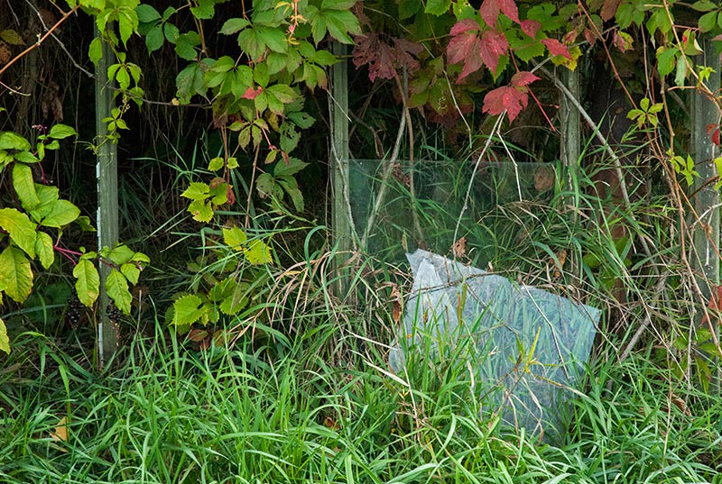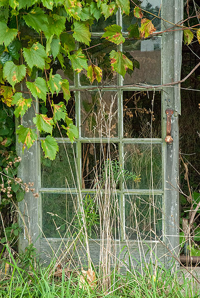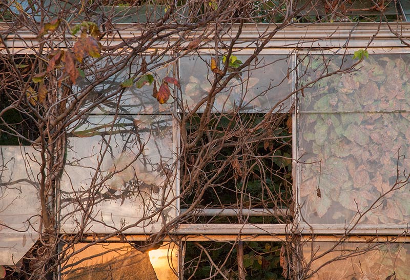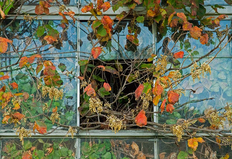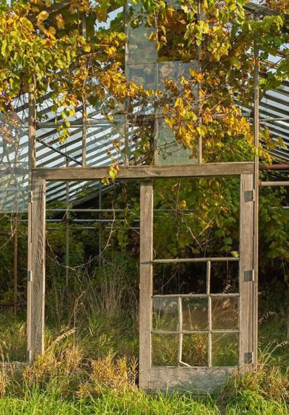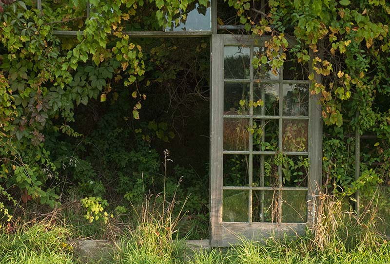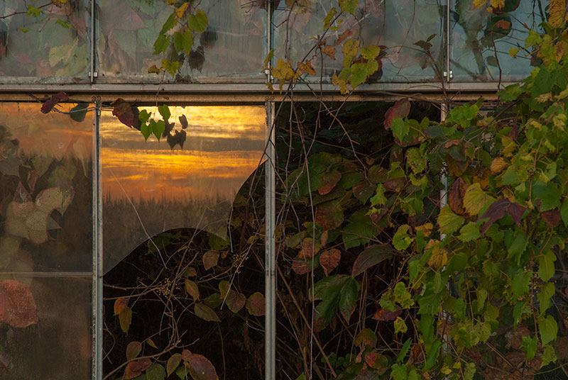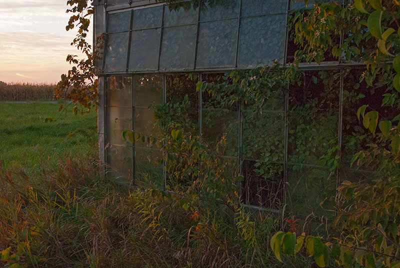 Yesterday morning I drove to another greenhouse complex a few miles from the one I photographed September 2. My friend Britt and I photographed these greenhouses several years ago, before they were as overgrown as they are now. I was hoping to catch the sunrise through the buildings, but when I arrived, I could see that that wouldn’t be possible: far too much vegetation was in the way. What I could get, however, was the sun and sky reflected in small portions of the exposed glass, and that was enough for me. I was thoroughly enjoying myself, even as the sun continued to rise, when my camera battery conked out. Worse still, I had forgotten to put my second battery in my backpack. I am resolved to return as soon as possible, this time with two fully charged batteries, green Wellies, and tripod. . . . Britt and I aren’t the only ones enchanted by these greenhouses. Shortly after Britt and I made our second foray out to them, we attended a photography show where we discovered the work of Pipo Nguyen-duy, an award-winning art professor at Oberlin College. Nguyen-duy has produced more than 200 images in his series of the greenhouses, which he calls The Garden. Nguyen-duy’s photographic eye is wider than mine usually is. Where I see opportunities to capture detail, he takes in the whole space before him. Then he prints the photographs large, which gives the viewer a sensation of being there. His work is stunning, as you can even tell on his website. (Look at The Garden 1 and 2—two collections—and In Process, where you can scroll down to a section on The Garden.). Imagine these images as big as 30 by 40 inches, as I saw them, or 45 by 60, or even 75 by 100 inches. He calls his series “an inquiry into the Garden of Eden as an abandoned site,” according to his website. “As if from the perspective of a natural scientist or archeologist,” he writes on his Statements page, “I have become increasingly intrigued with the idea of the abandoned greenhouses as a future relic of a man-made Garden of Eden. Beyond serving as metaphorical landscape, I hope that my images from The Garden will also serve as a document of a vanishing part of Ohio’s unique history.” Read reviews of Nguyen-duy’s work (especially here and here) to learn more about how his photographs express his thinking about personal and universal themes. I’ll save the narrative of my own photographic vision for another time.
