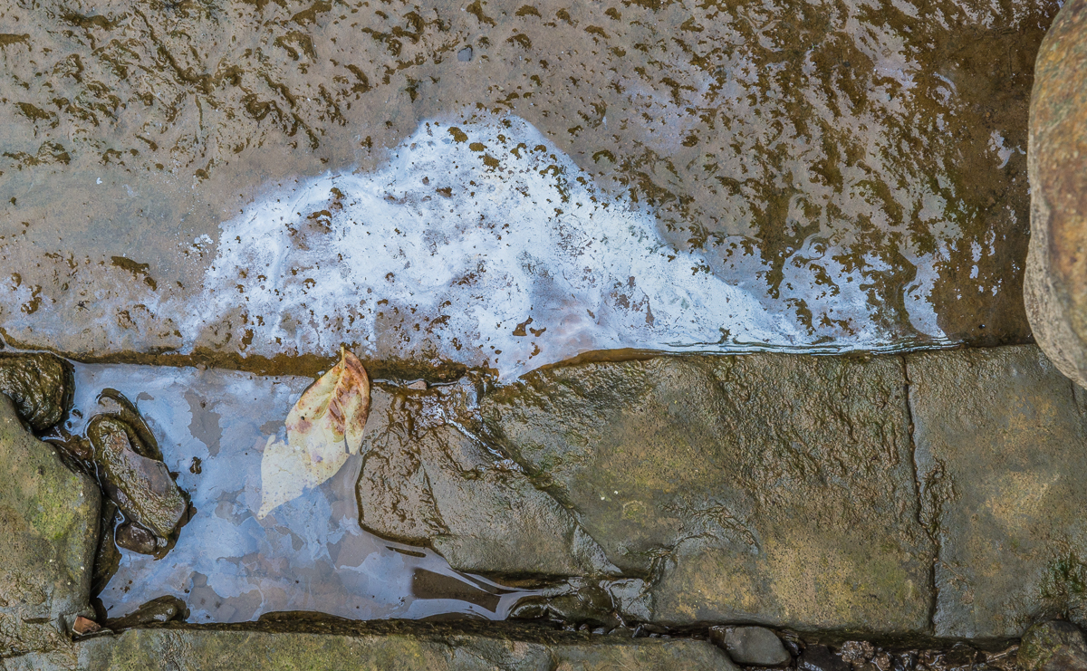 Young Leptothrix discophora films are silvery blue and relatively uniform in thickness. Harsh wind, rain, or faster water arriving from upstream—or animals tromping through them—can disperse the films before they ever becomes as colorful as shown, for example, in the blog post of August 19. But gentle motion of wind or water can make the film break apart only slightly, causing film platelets to slide over and under each other, stacking up to varying thicknesses. It’s the varying thicknesses of the film that create the more colorful look. This kind of color is the result of thin-film interference.