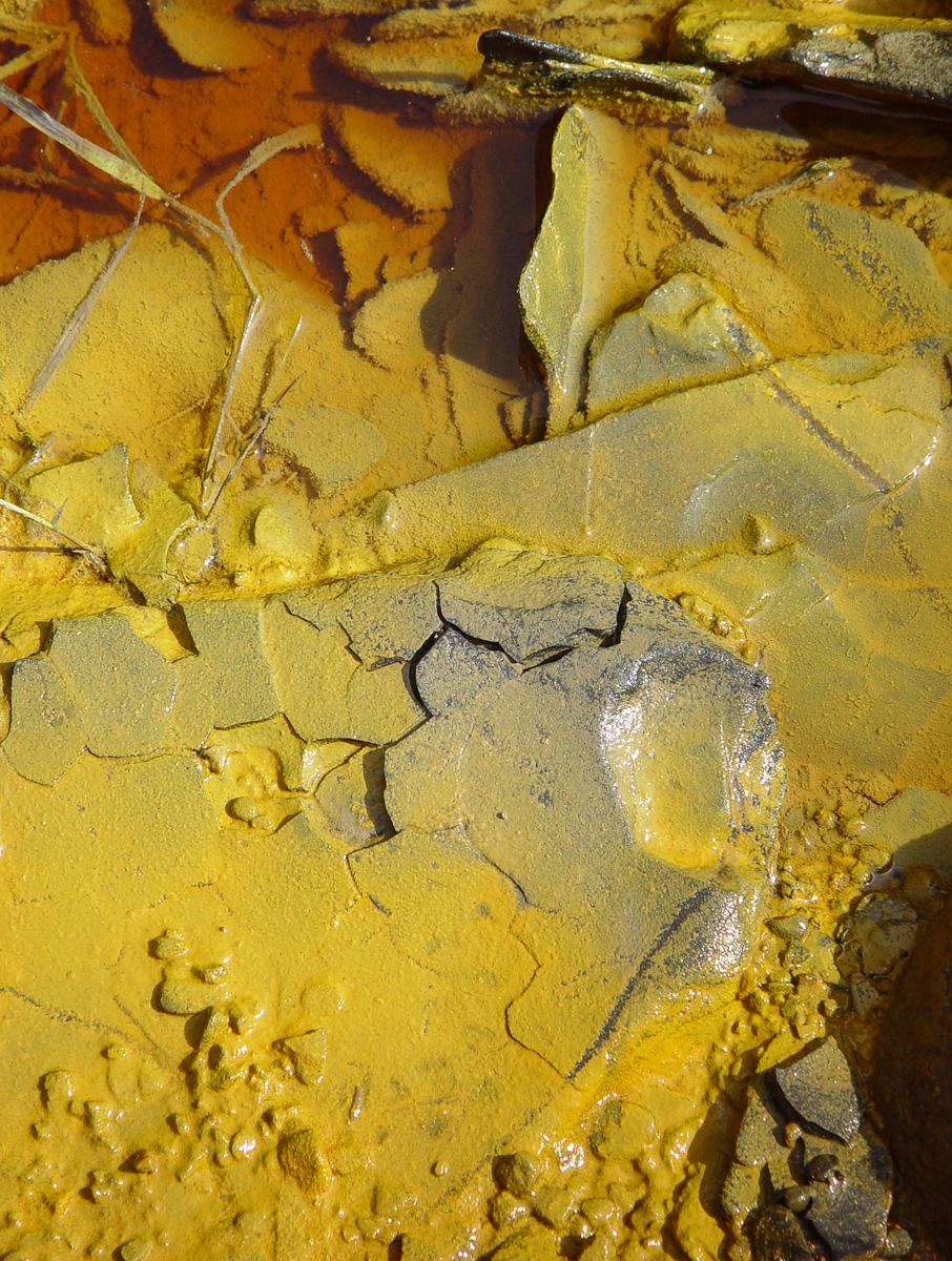 Taken August 25, 2002, this photograph shows a layer of the yellow mineral schwertmannite atop grey-blue shale at the edge of Ohio’s Vermilion River. As I was checking before I posted to make sure schwertmannite has two n’s, I came across the abstract of a book chapter that raises the question of whether schwertmannite—a compound composed of iron, oxygen, hydrogen, and sulfur—occurs on Mars. I don’t understand much of the abstract, but I do get that the book-chapter’s author believes the mineral’s possible occurrence on Mars could be a result of “chemical weathering processes as acidic groundwater came in contact with the [Mars] atmosphere.” Biogeologist Norrie Robbins, whom I consulted when writing They Breathe Iron has another idea about the formation of schwertmannite, which adds excitement. She says that schwertmannite accumulates as tiny spheres around the cells of a still-unnamed bacterium. So here’s a thought: If schwertmannite exists on Mars, it could be in association with a life form. Pretty thrilling, eh? . . . The tea-colored stuff at the top left in this photograph, by the way, is how iron oxide looks when it dissolves in water. Here’s what I wrote in the book next to this photograph: