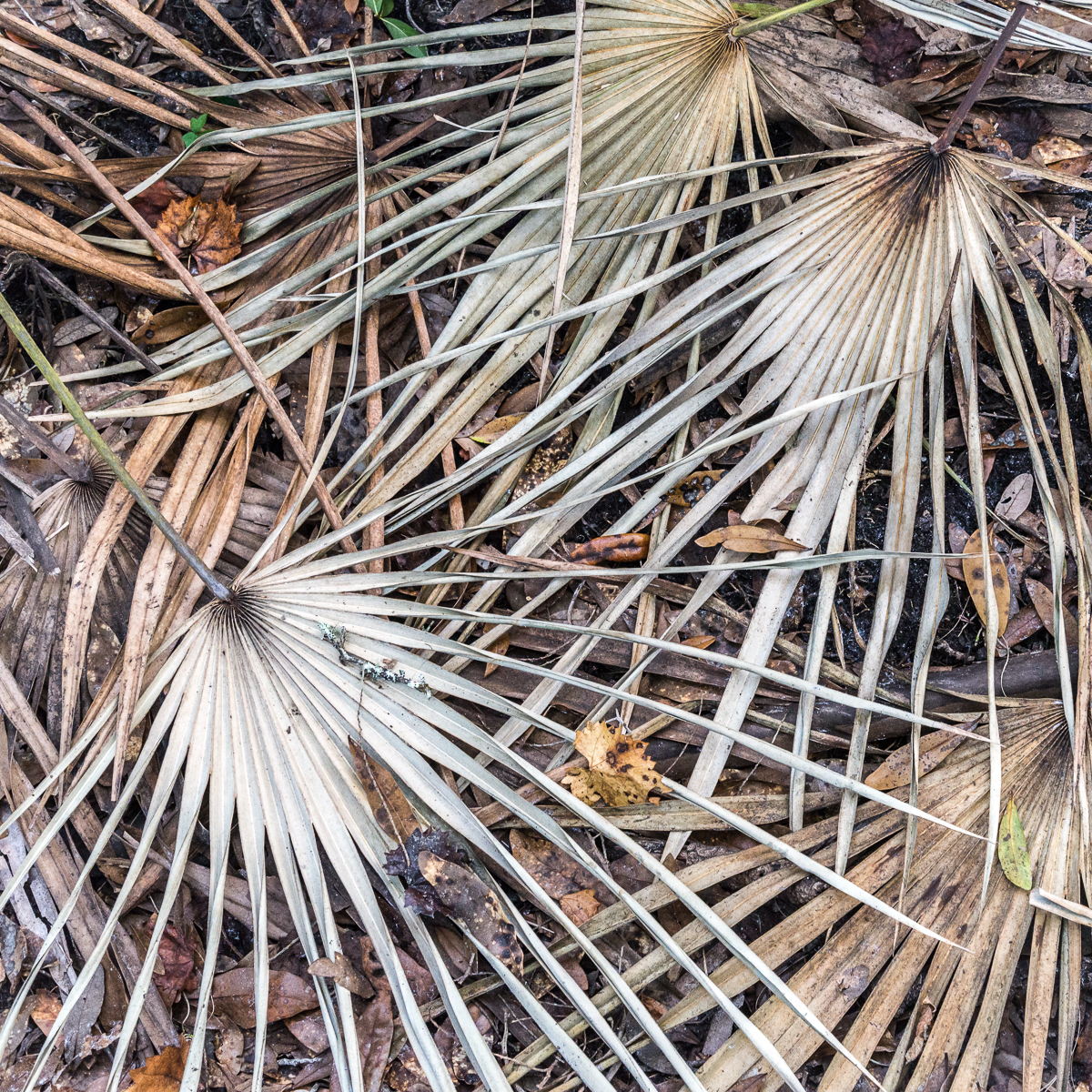 If you missed the discussion in yesterday’s comments section about regularity and irregularity, order and disorder, and what these qualities have to do with our perception of beauty, I urge you to go back to that post and see what Robert Sims and nannus have to say. Meanwhile, here are some more spent palm fronds on the forest floor.