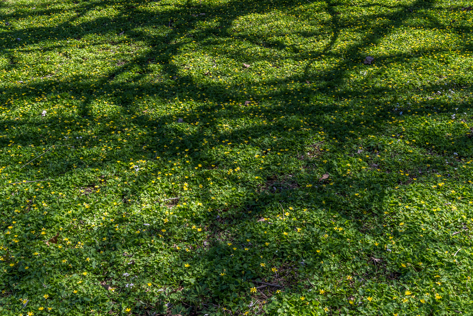These buttercup relatives (lesser celandine or Ranunculus ficaria) were mostly near the river—and they were all over. Botanist David says they are invasive, and websites confirm this. . . . When the nearby trees leaf out, their shadows may not be as interesting.