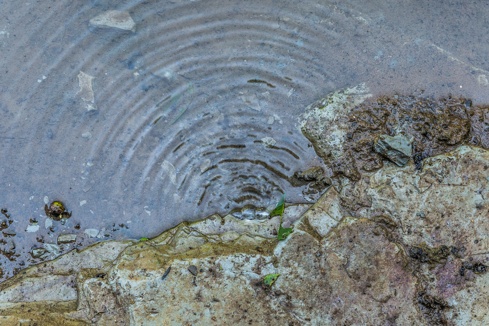 As I continued to walk northward along the river last Tuesday, I saw concentric arcs in the water. Coming closer, I could see that they were being made by gas bubbling from under the shale shelf of the shoreline. I’m guessing that this is the shale gas of fracking fame/infamy.