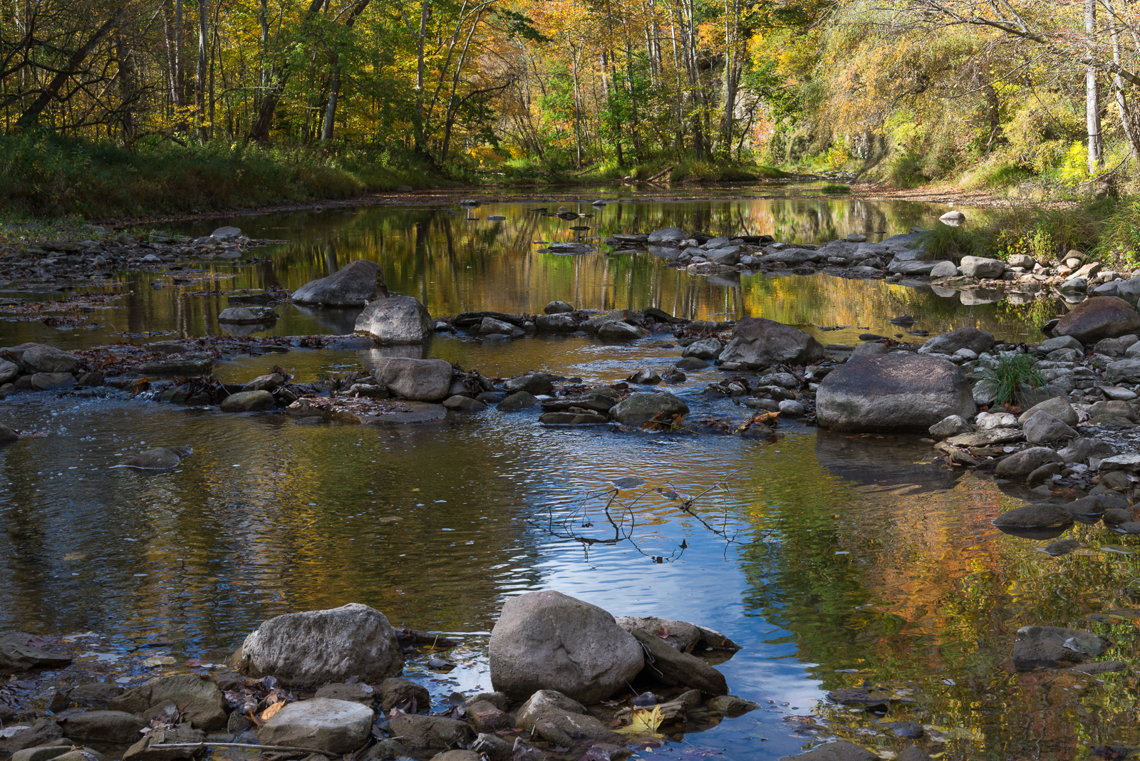 When I went to the Schoepfle Garden last Wednesday, it was in hopes of finding great swaths of rainbow-colored Leptothrix discophora films. As usual. But with higher hopes than usual because October has always been a great month for the films. Maybe it was the lingering effects of the summer drought that kept them mostly at bay, but I found only a few this time. Instead, it turned into a day of enjoying the reflections of fall trees in the river—not an altogether bad thing. The clump of trees in the middle of the top of this photograph is on a small island. The river flows around it toward the viewer.