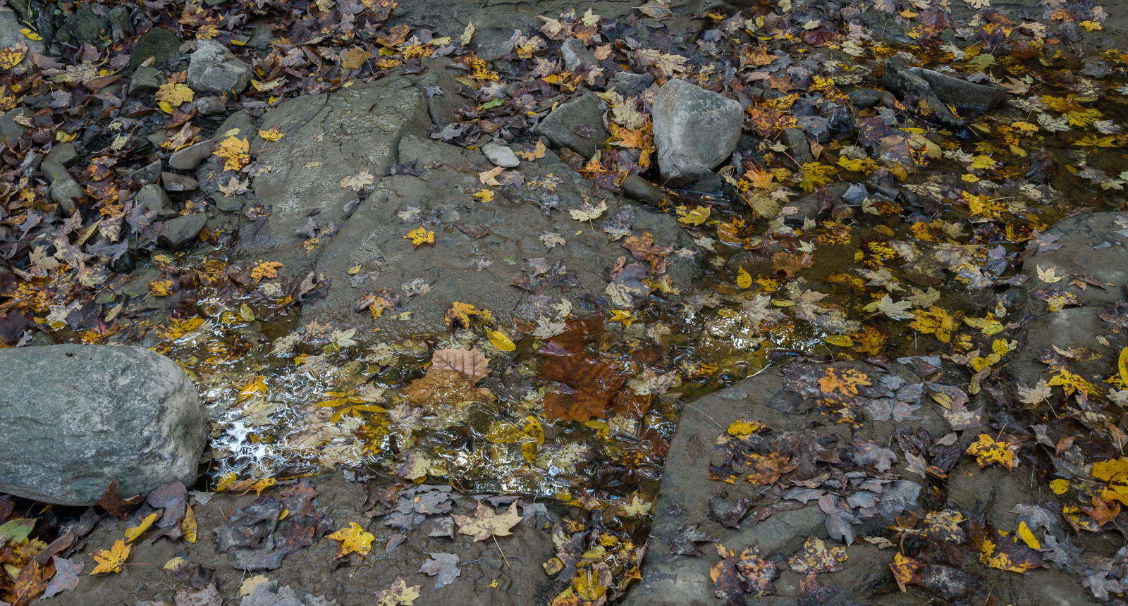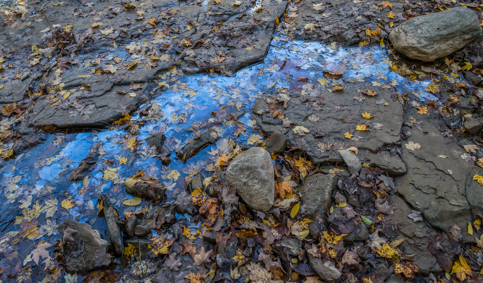 I found some of what I had come looking for last month when I waded across the river. The first image is the way I saw the patch of Leptothrix discophora film as I approached. It was surprisingly large for such a young film. Young films look blue or silver or silver blue. The prismatic colors arise when the film thickens as a result of more of its being produced by the Leptothrix discophora bacteria or when the film is broken and pieces of it slide over and under other pieces. The second image is the same patch of film seen from the opposite side. You can appreciate the importance of the angle of the sun relative to the viewer in how the film appears.