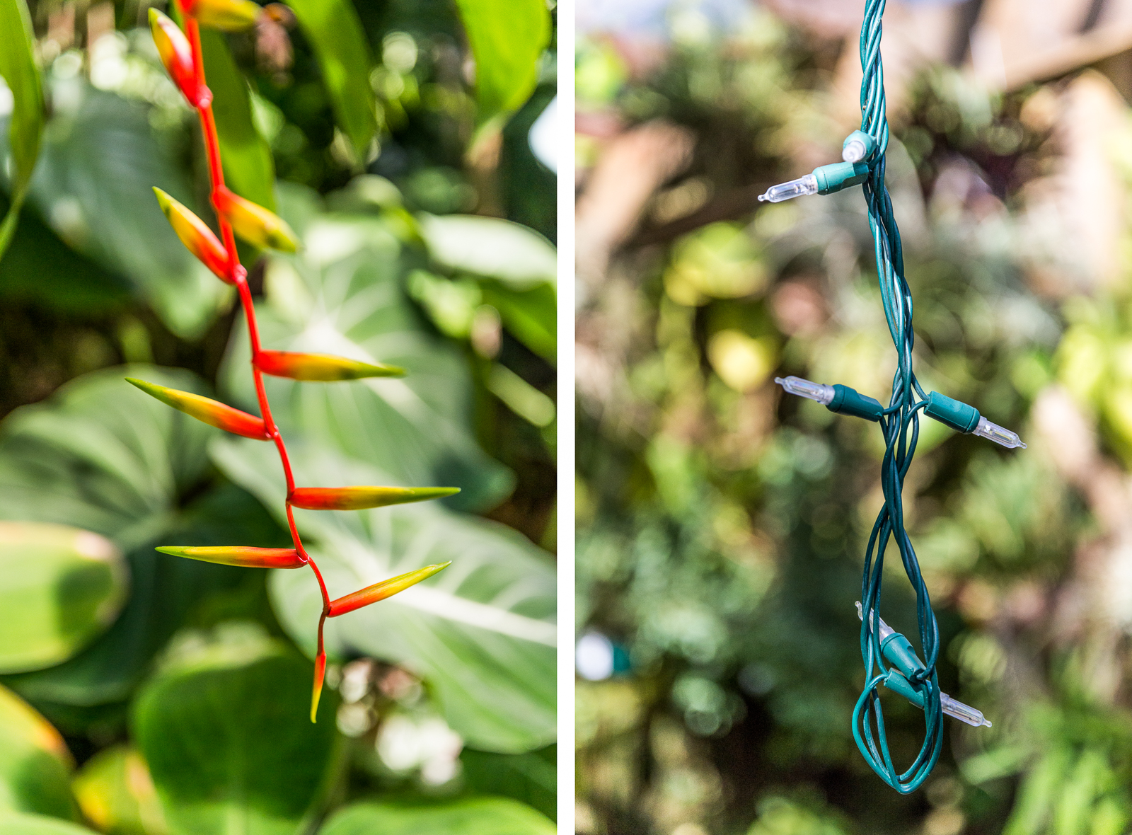 On New Year’s Eve day I photographed the pendant inflorescence (husband speak for “hanging-down flower”) of a bromeliad that belongs to the genus Vriesea, shown in the lefthand part of this diptych. When I turned around to continue walking in the Selby Garden’s conservatory, I almost ran into its very, very distant relative shown in the righthand part of the diptych.
