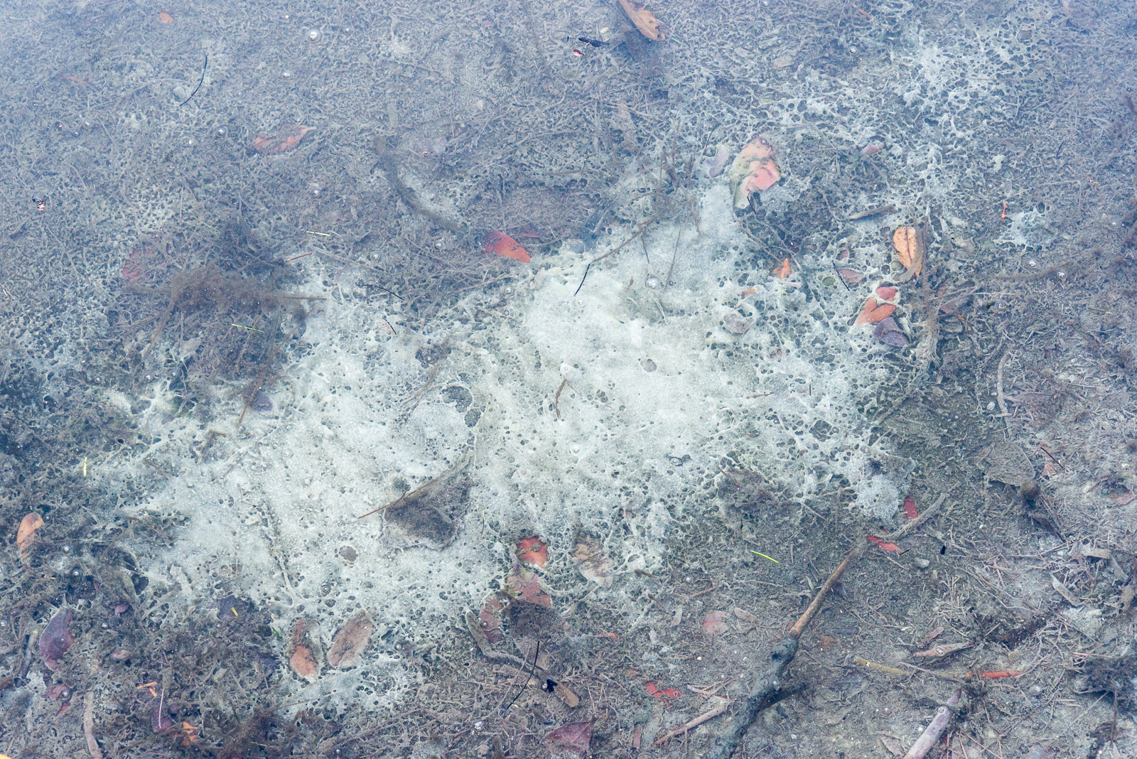 On New Year’s Day David and I went to South Lido Park, perhaps my favorite park around Sarasota. It has such a variety of things to love with the camera. One of the lagoons there showed considerable evidence of the sulfur bacteria. This is not surprising since the water in Sarasota—even coming out of the tap—contains quite a bit of sulfur. When I started coming to Florida 12 years or so ago, I had to drink bottled water—either that or keep the tap water in the refrigerator to kill off the taste. Now I drink water from the faucet without thinking about it; it’s just water to me. I also see signs of sulfur bacteria in Ohio’s Vermilion River but not in such profusion or so often as I do here in Florida. Sulfur bacteria, like the iron bacteria, are chemolithotrophs: they energize their life processes with inorganic compounds in a process of respiration. (This is why my book about the iron bacteria is called They Breathe Iron. If I had written a book about the sulfur bacteria, I might have titled it “They Breathe Sulfur.”)