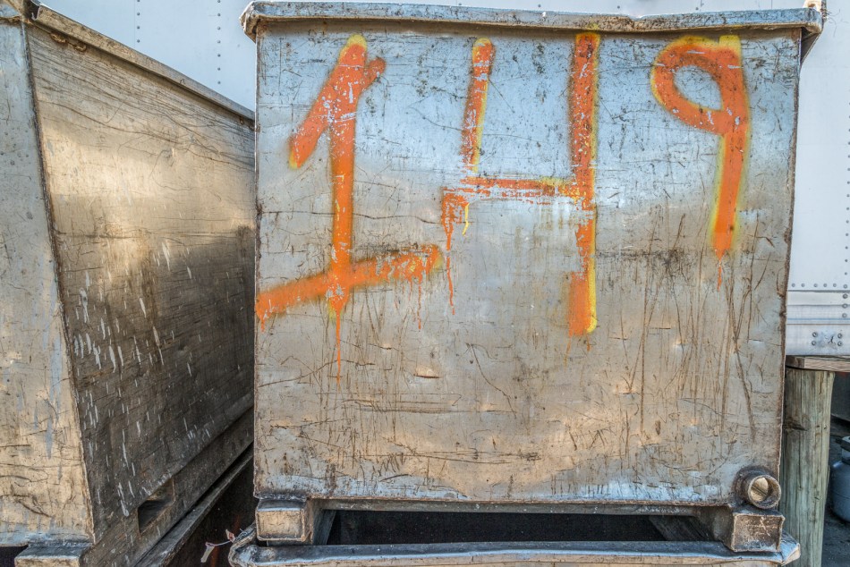 What i love is the brutish, swaggering. off-kilter shapes of the boxes AND the scratched surfaces, AND the orange scrawled numbers – yes, even better full screen. You have composed to show the forms and exposed to show the surfaces. Perfect.