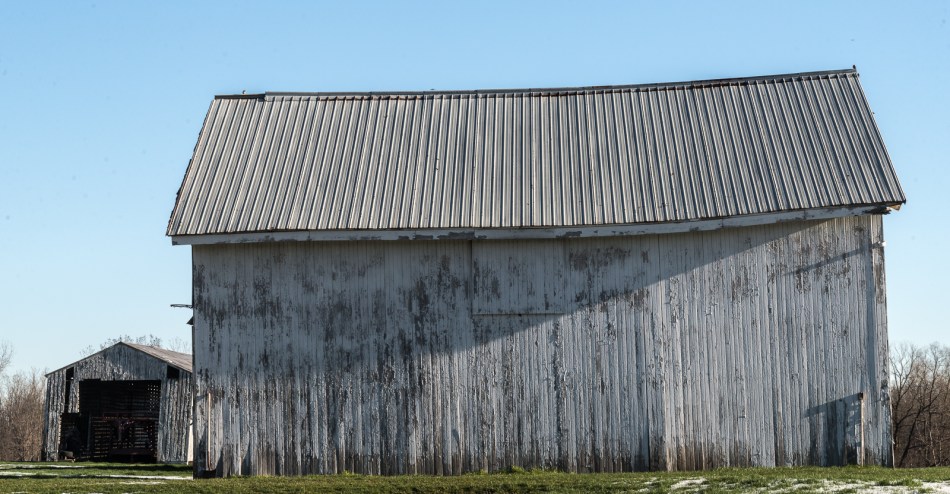 A couple of weeks ago I went wandering by car around the northern Ohio countryside. Most of what I saw was farmland, often adorned with photogenic barns. The leanings of the outbuildings in this photograph are not due to lens distortion. The structures really slouched like this.