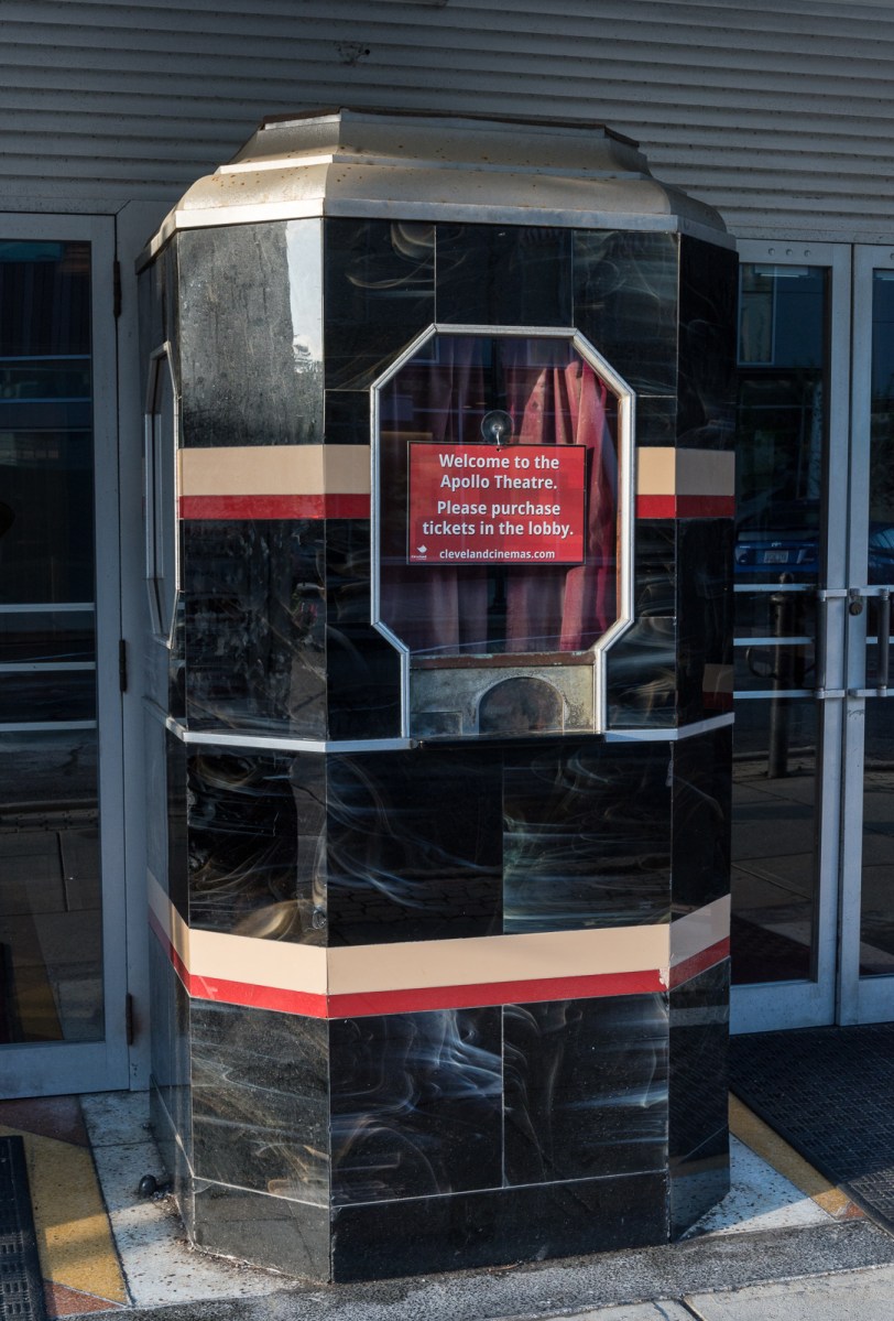 Oberlin’s Apollo Theater was renovated a few years ago, and the old ticket window is no longer in use. Now you buy your ticket inside, at the new concession stand, a less aesthetically pleasing experience but a warmer one, welcome in Oberlin’s often-cold winters. The second photograph shows the whole ticket booth.