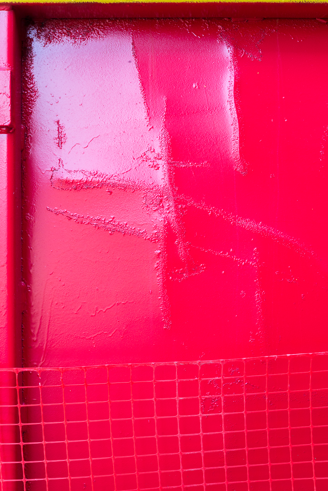 The highlight works beautifully here, playing against the fence, I think. I like those fences, but it seems they’re switching to a solid cloth construction fence around here instead of the open plastic ones – still orange but not as fun. Yours here is a little different. I can’t help wondering if it was hit with the red paint too.