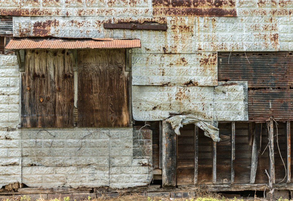 2. This old building seem to be a gold mine for images. That looks like pressed tin, like you used to see on ceilings. I don’t remember seeing it used as siding. That one piece that’s crumpled…speaks volumes. And the boarded up window with the awning. I love the colors but I imagine this would be beautiful as a black and white, too.