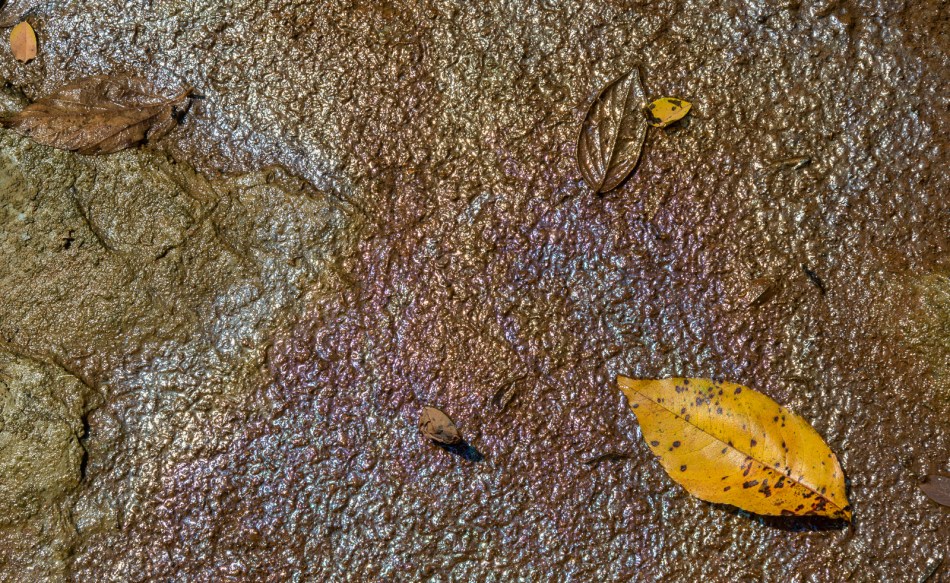 • This kind of iridescence on almost-dry ground is what you can often see when the level of the water in the river goes down very slowly so that the bacterial film isn’t disturbed. Thanks for writing, Cathy.