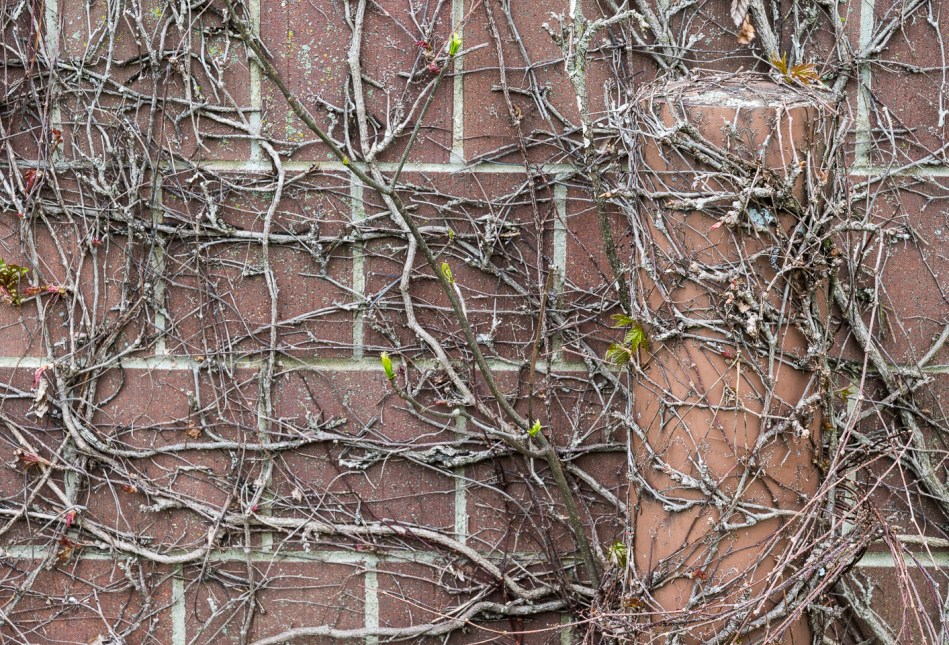 It is tempting to think that all of spring came rushing in to Oberlin Tuesday, when our temperatures soared to the lower 80s. Nearly every tree that possibly can, has burst into bloom. But here and there, as with the vines on the wall marking the back boundary of the library property, progress is a little slower.