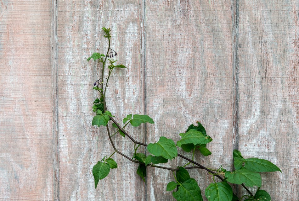 This entry was posted on July 13, 2018 by Linda Grashoff. It was filed under Built Environment, Leaves, Outbuildings, Plants and was tagged with climbing nightshade, leaves, wooden siding.