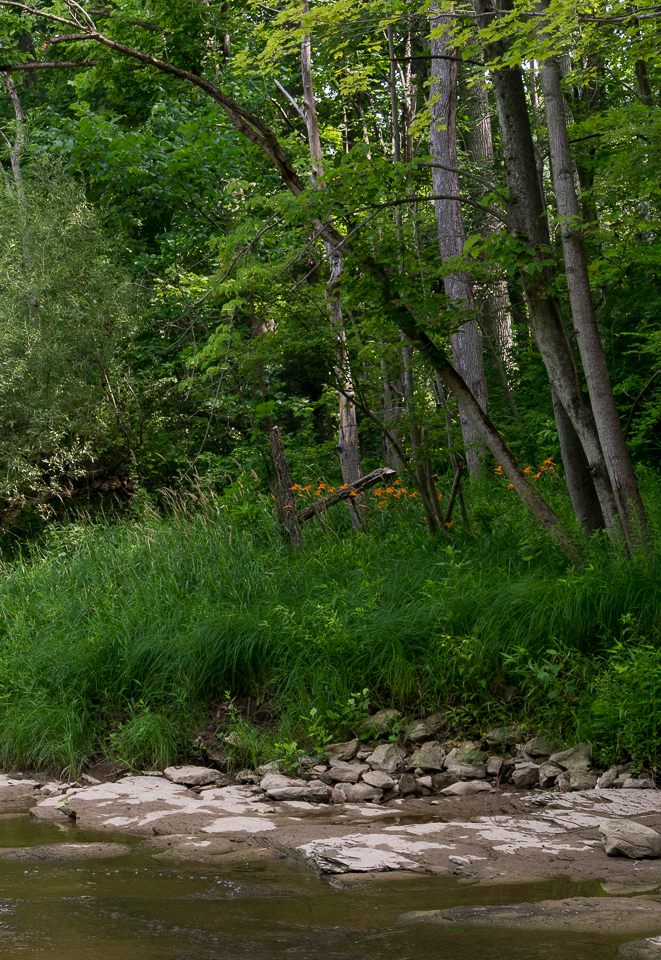 When I had almost reached the other shore of the Vermilion River (see yesterday’s post), I looked up and saw some day lilies where I didn’t expect to see them. Along the sides of plowed fields in the country, and in people’s gardens, yes, but not in the woods.