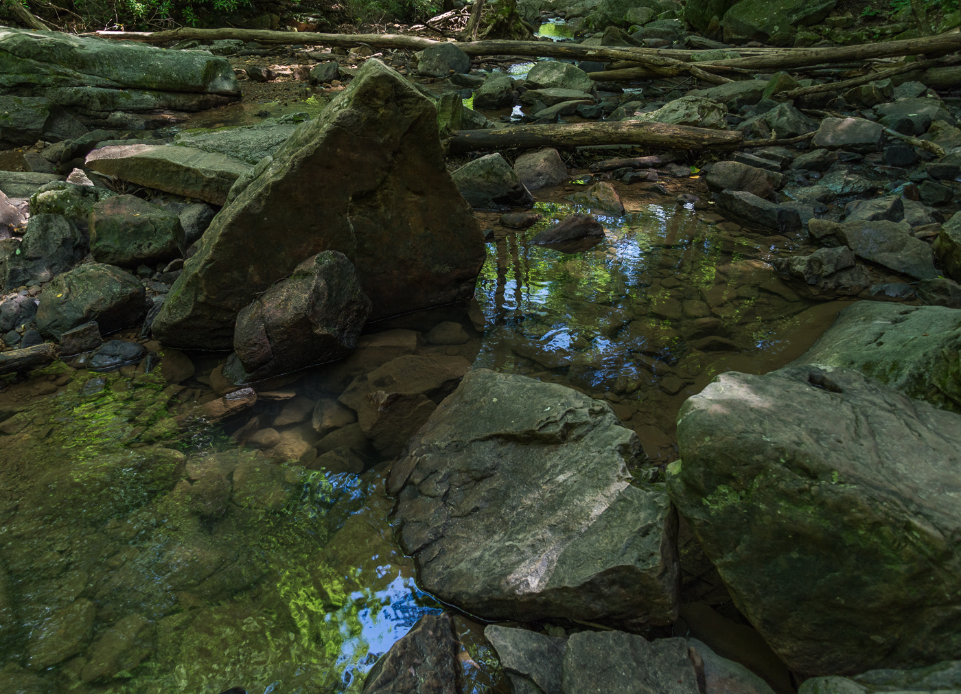 Strictly speaking, this photograph does not show the falls but the pooled and slowly moving water of Cucumber Run between the falls and the Youghiogheny River. The colors in the water are reflected trees and sky.