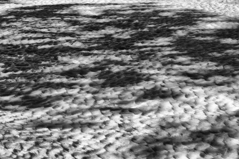 1. The plant in the first picture didn’t change, but the ice beneath it looks so different. The would-be tree shadow in #5 is neat; its colors, along with those in #4, are welcome in winter. #6 offers a good contrast between the linear texture of the grass and the granular texture of the snow. And what appealing scalloping in the rained-upon, windblown snow in your closing picture.