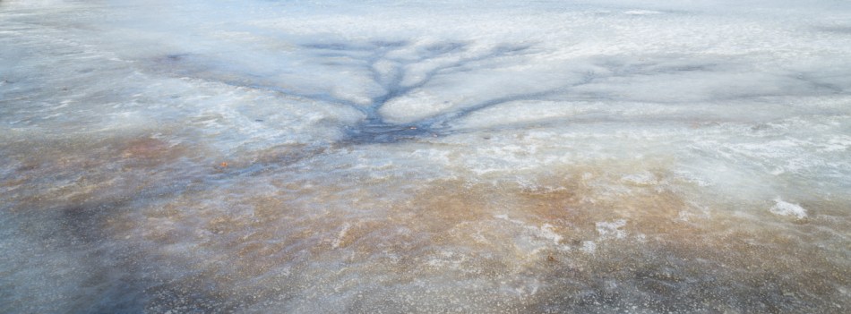 5 A drain tile emptying into Heiser Pond makes a pattern in the thawing ice that resemble a tree’s shadow.