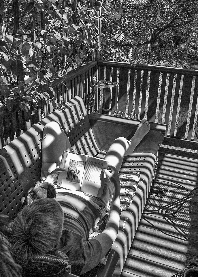 8 Taking a break from cooking (I’m guessing; I don’t really remember, but she is a fantastic cook), my daughter-in-law was as striped as the rest of the back porch.