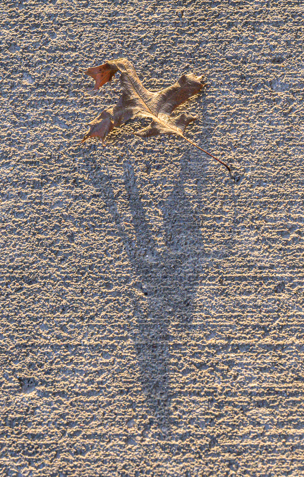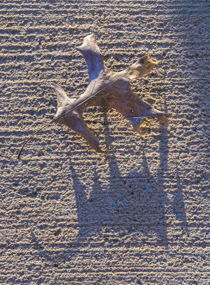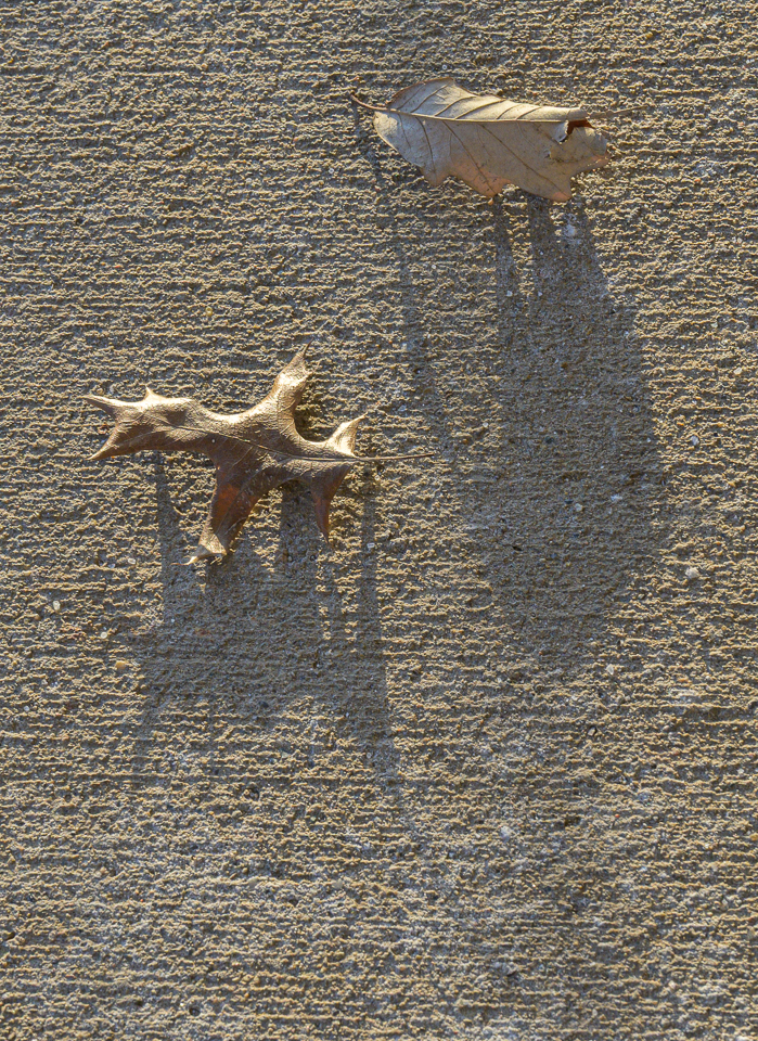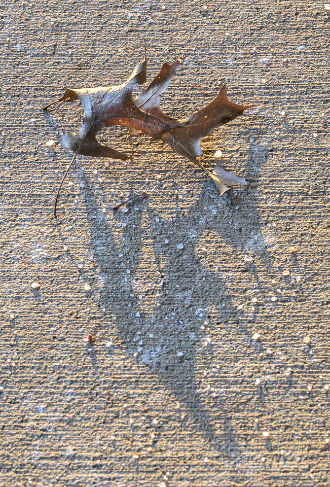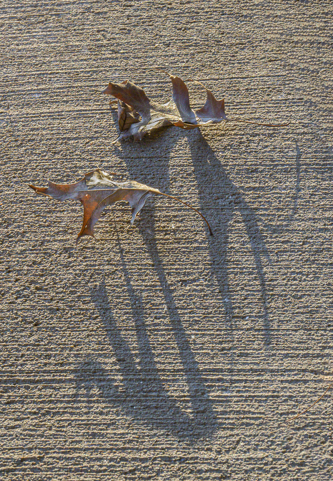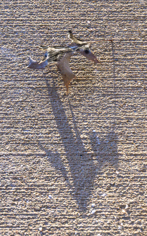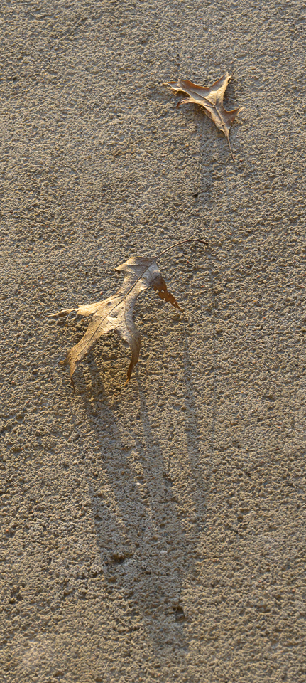 A deluge of dried oak leaves seemed to appear suddenly on the sidewalks of my retirement community last month. I was puzzled until I remembered that some oak leaves don’t fall off their trees until spring. Walking home one day I noticed that the late afternoon sun had picked out the leaves in a delightful way. I went inside and grabbed the camera. Entranced with the leaves that seemed to dance across the cement even when they were still, I wasn’t aware of the shadows right away. They turned out, I think, to be important elements of these photographs, some of which I took the next morning.