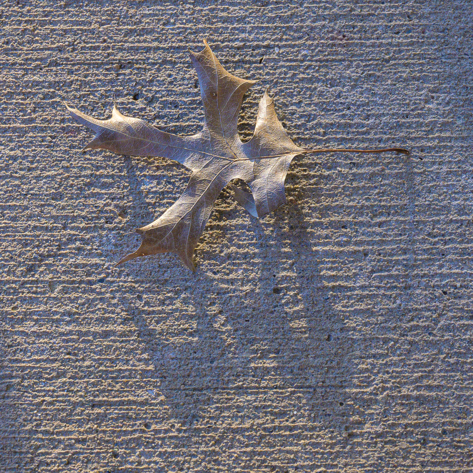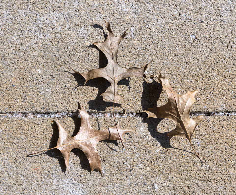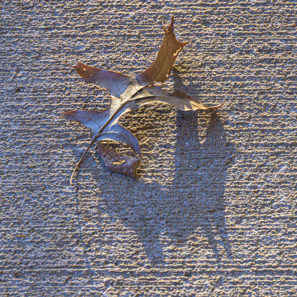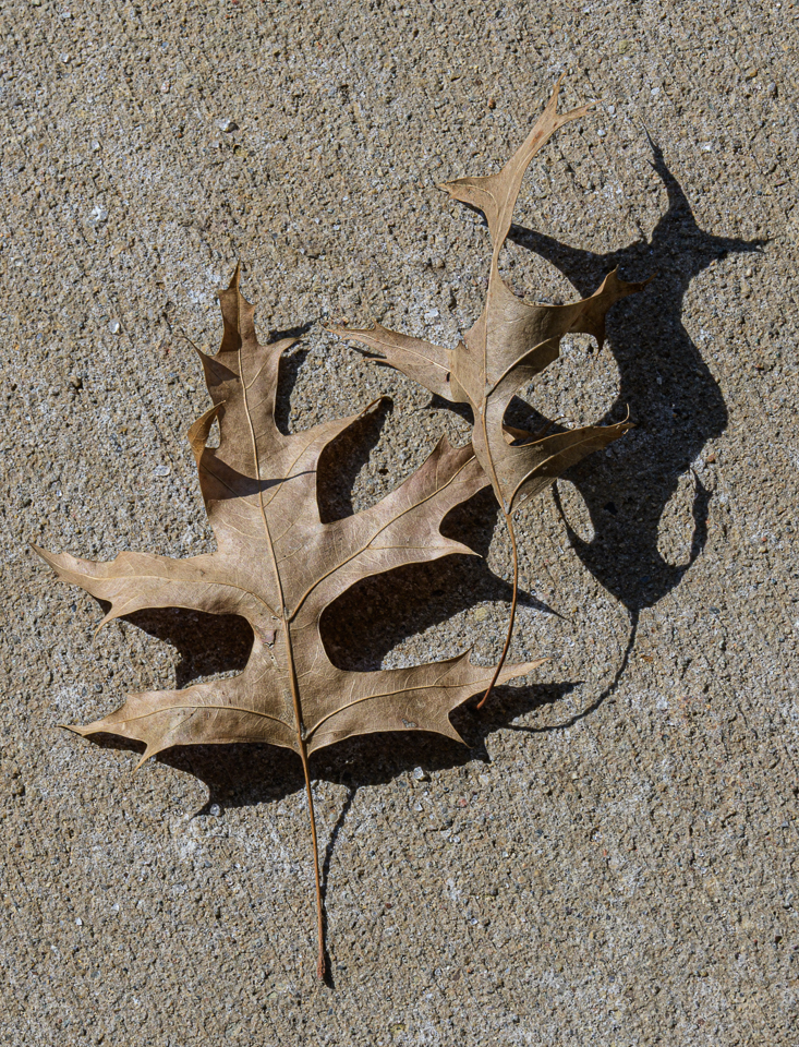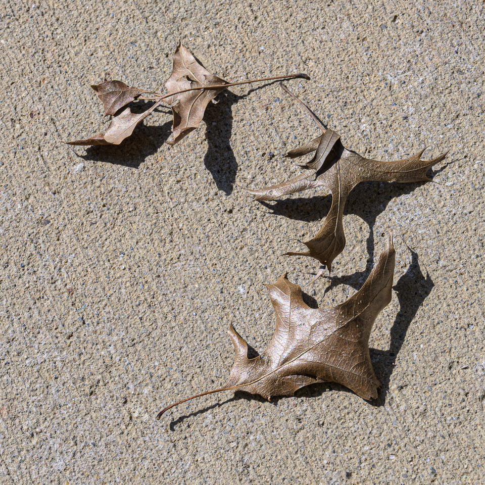 A deluge of dried oak leaves seemed to appear suddenly on the sidewalks of my retirement community last month. I was puzzled until I remembered that some oak leaves don’t fall off their trees until spring. Walking home one day I noticed that the late afternoon sun had picked out the leaves in a delightful way. I went inside and grabbed the camera. Entranced with the leaves that seemed to dance across the cement even when they were still, I wasn’t aware of the shadows right away. They turned out, I think, to be important elements of these photographs, some of which I took the next morning.