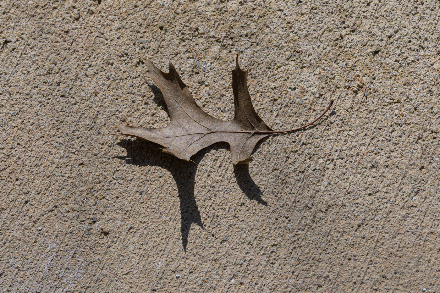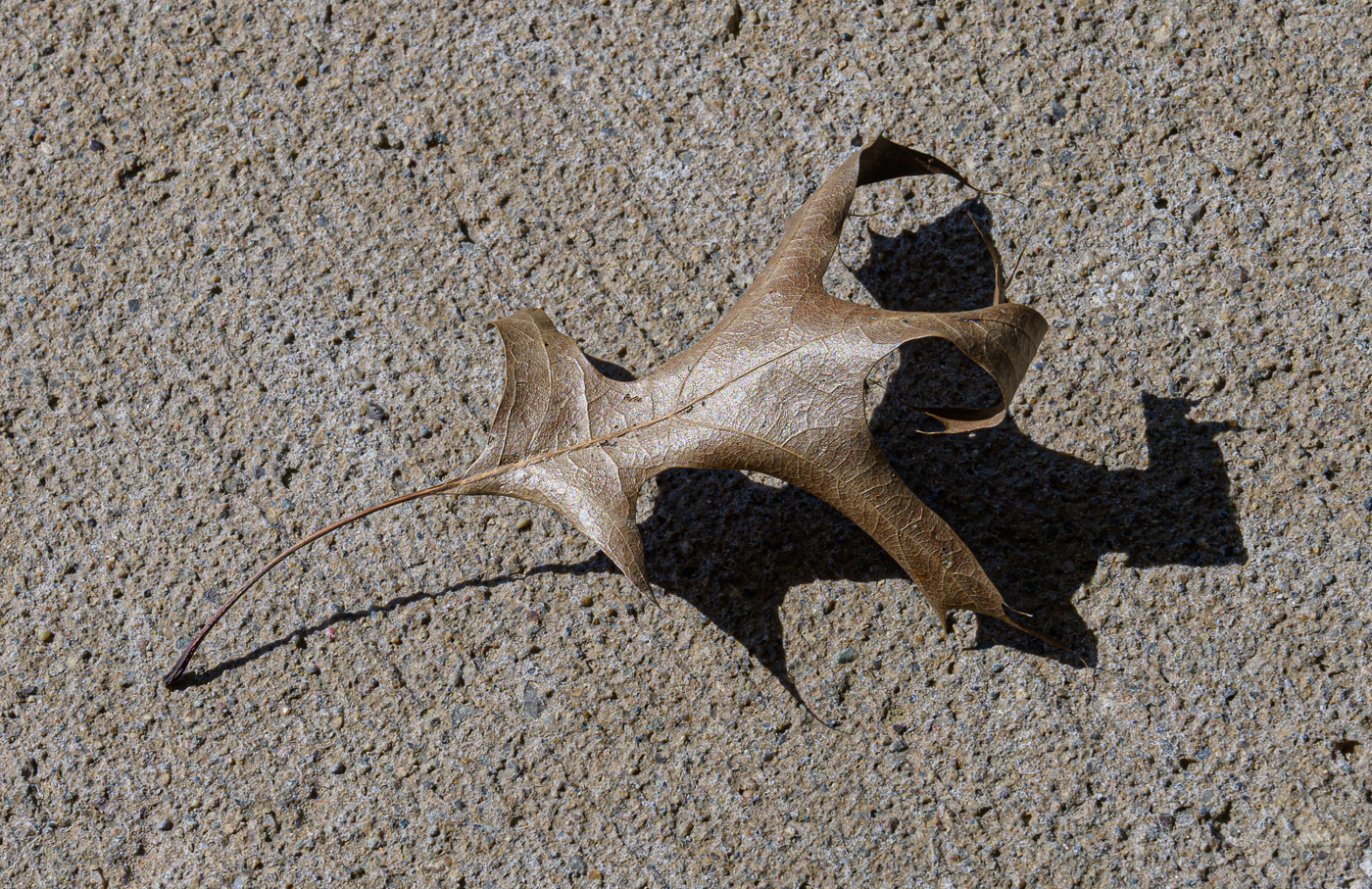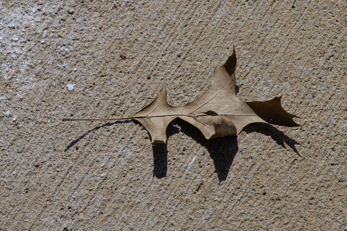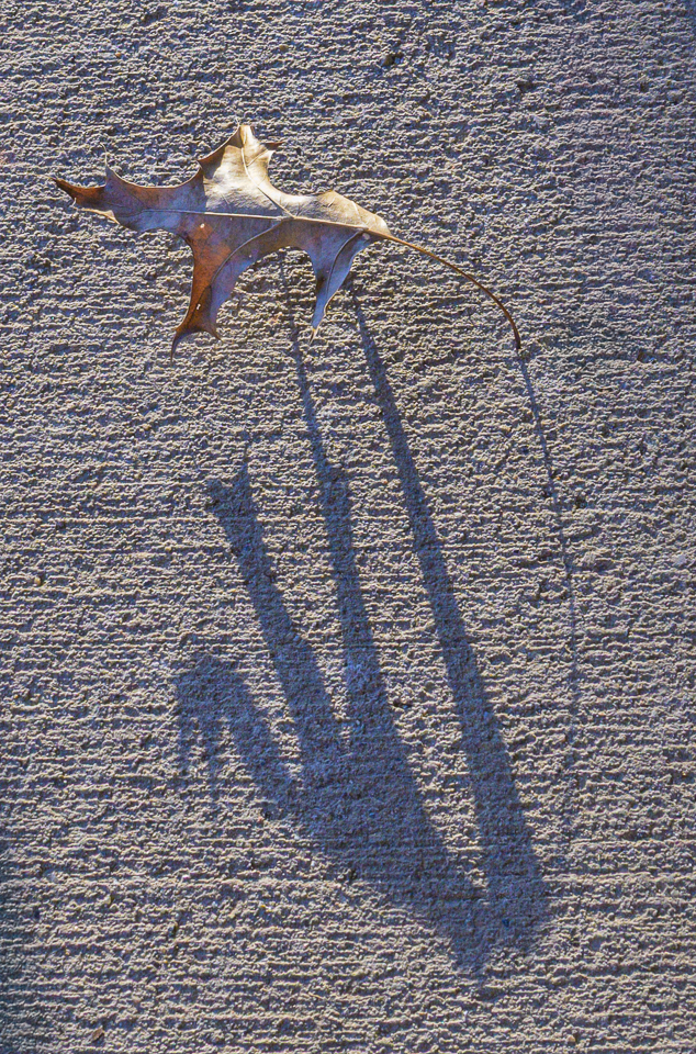 A deluge of dried oak leaves seemed to appear suddenly on the sidewalks of my retirement community last month. I was puzzled until I remembered that some oak leaves don’t fall off their trees until spring. Walking home one day I noticed that the late afternoon sun had picked out the leaves in a delightful way. I went inside and grabbed the camera. Entranced with the leaves that seemed to dance across the cement even when they were still, I wasn’t aware of the shadows right away. They turned out, I think, to be important elements of these photographs, some of which I took the next morning.