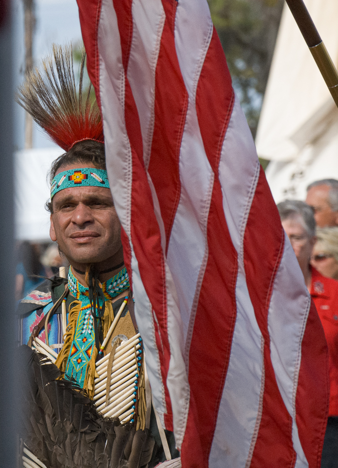 6 This man is one of several participating in a short ceremony held during the powwow to honor Native Americans’ military service. In spite of the atrocities Europeans and European Americans committed against Native Americans, those who lost so much serve in the US military at five times the national average.