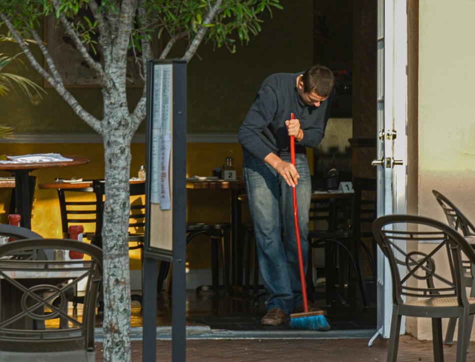 In early-morning downtown Sarasota, a restaurant worker sweeps out from the previous night.
