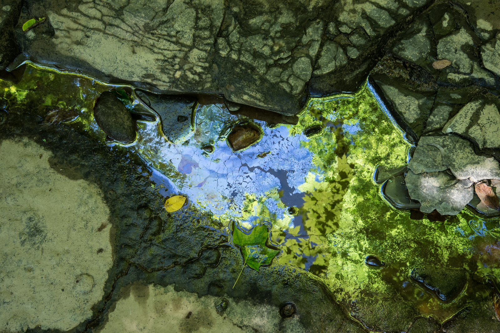 You can see enough iridescence here for me to include this photo in the series, but what really got me was how clearly you can see the reflections of individual leaves in the water and Leptothrix discophora film.