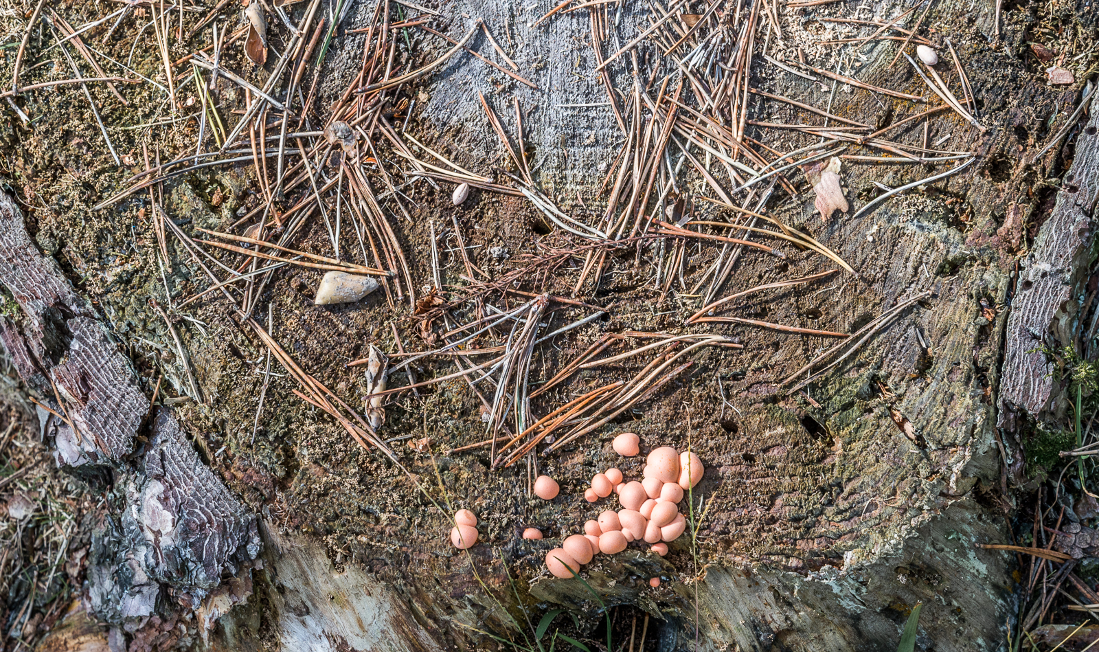 An expert on mushrooms I’m not, but I do have an interest. I have never seen these little guys. Maybe when they grow up they will look familiar. Here on the pine stump the biggest one is about half an inch in diameter. . . . The more I look at this photograph, the more I wonder if they are puffballs. I’ve never seen pinkish-orange puffballs, and I’ve never seen puffballs growing on a tree stump.