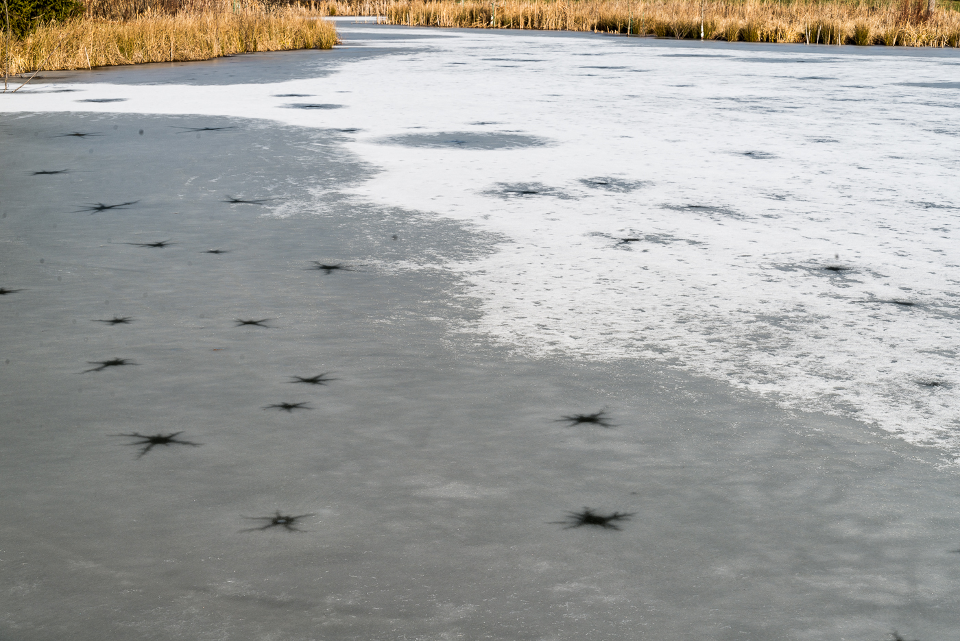 2 The black things are almost-holes in the ice. Can someone tell me—or guess—how they form?