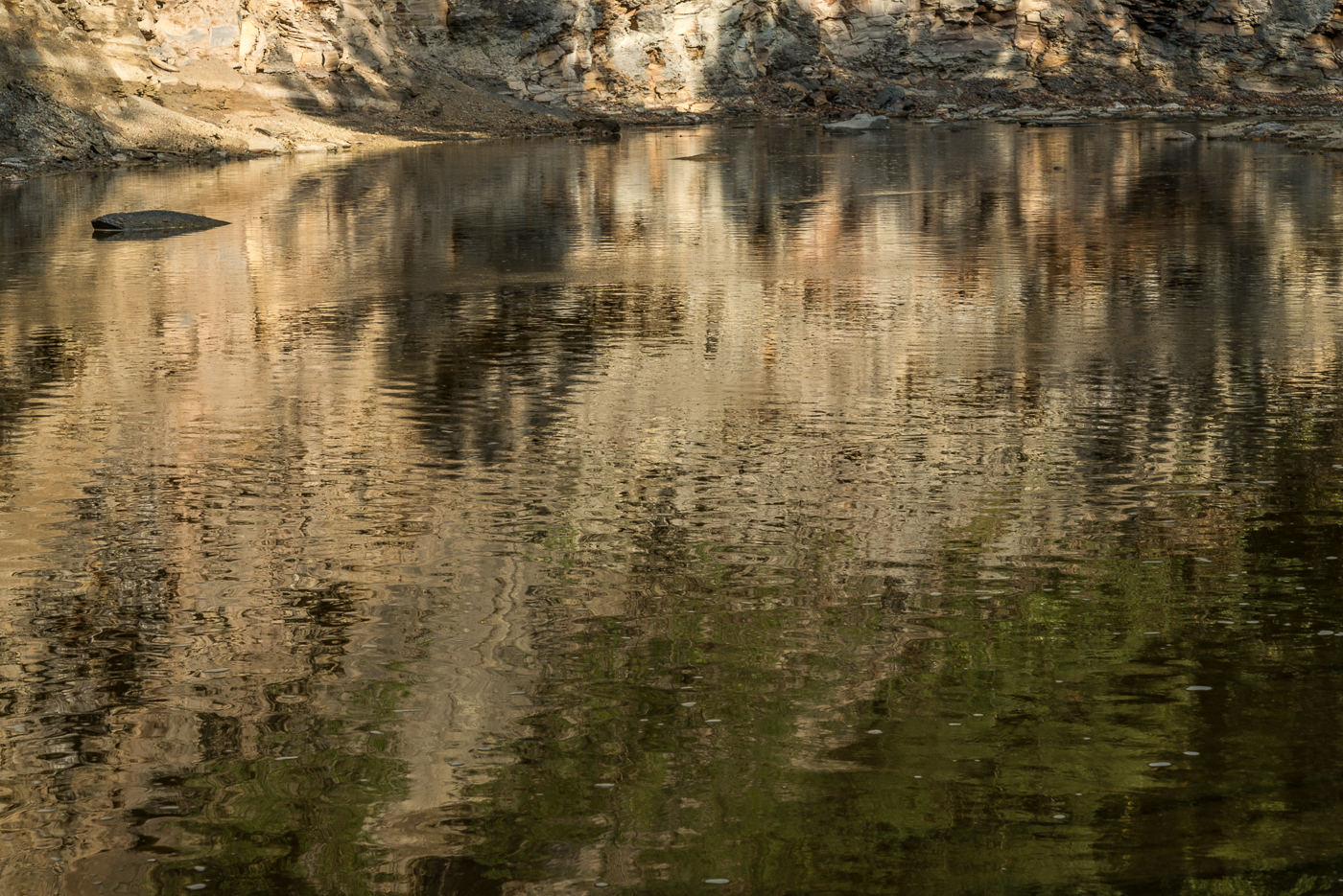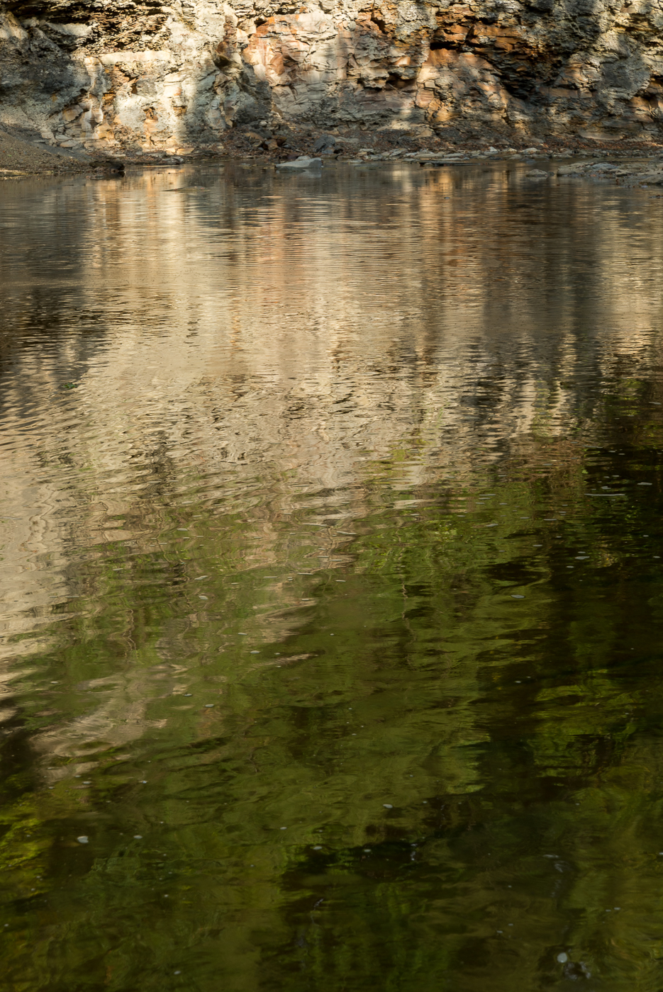 There is a spot downriver where the light-tan cliffs are a quite high. The river is shallow right there, and I can easily wade around in the middle to catch their reflections filling the whole width of the river. Absent much foliage and distorted by gentle ripples, the effect is almost other worldly.