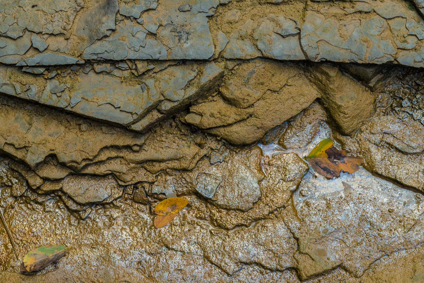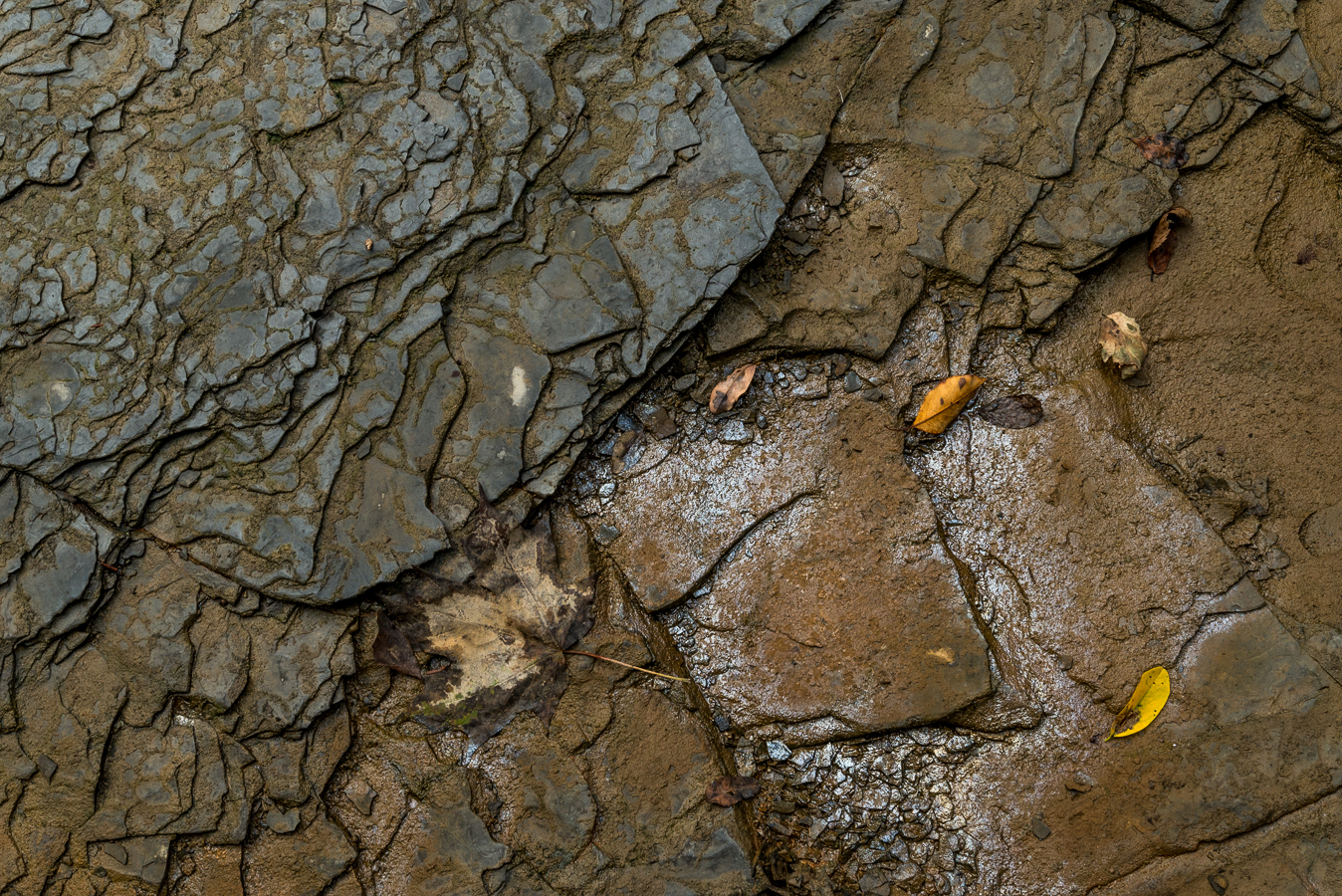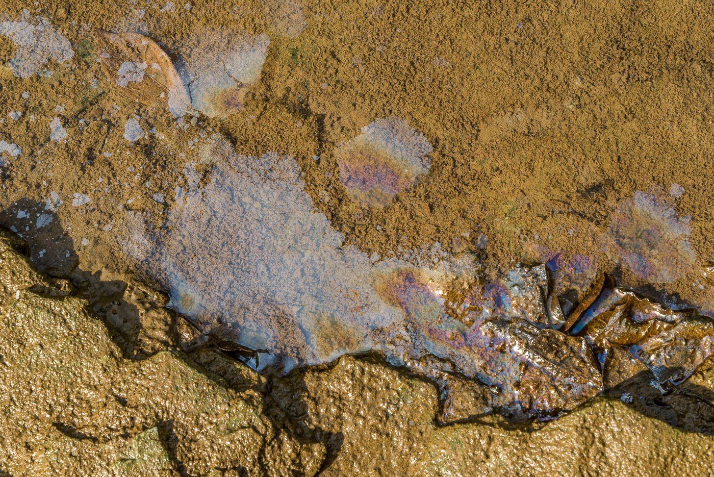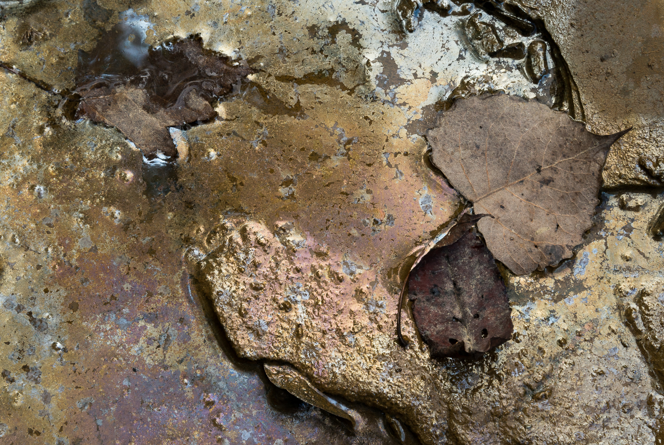 Sometimes a Leptothrix discophora film can look colorful but very shear, very translucent. Why? I don’t know. (For that matter, I don’t know why some of the L. discophora films look opaque.) The first photo shows what I mean. The other four photographs show a film where much or all of the water has run out from underneath it as the river recedes from the bank so that the film rests on rocks or soil.