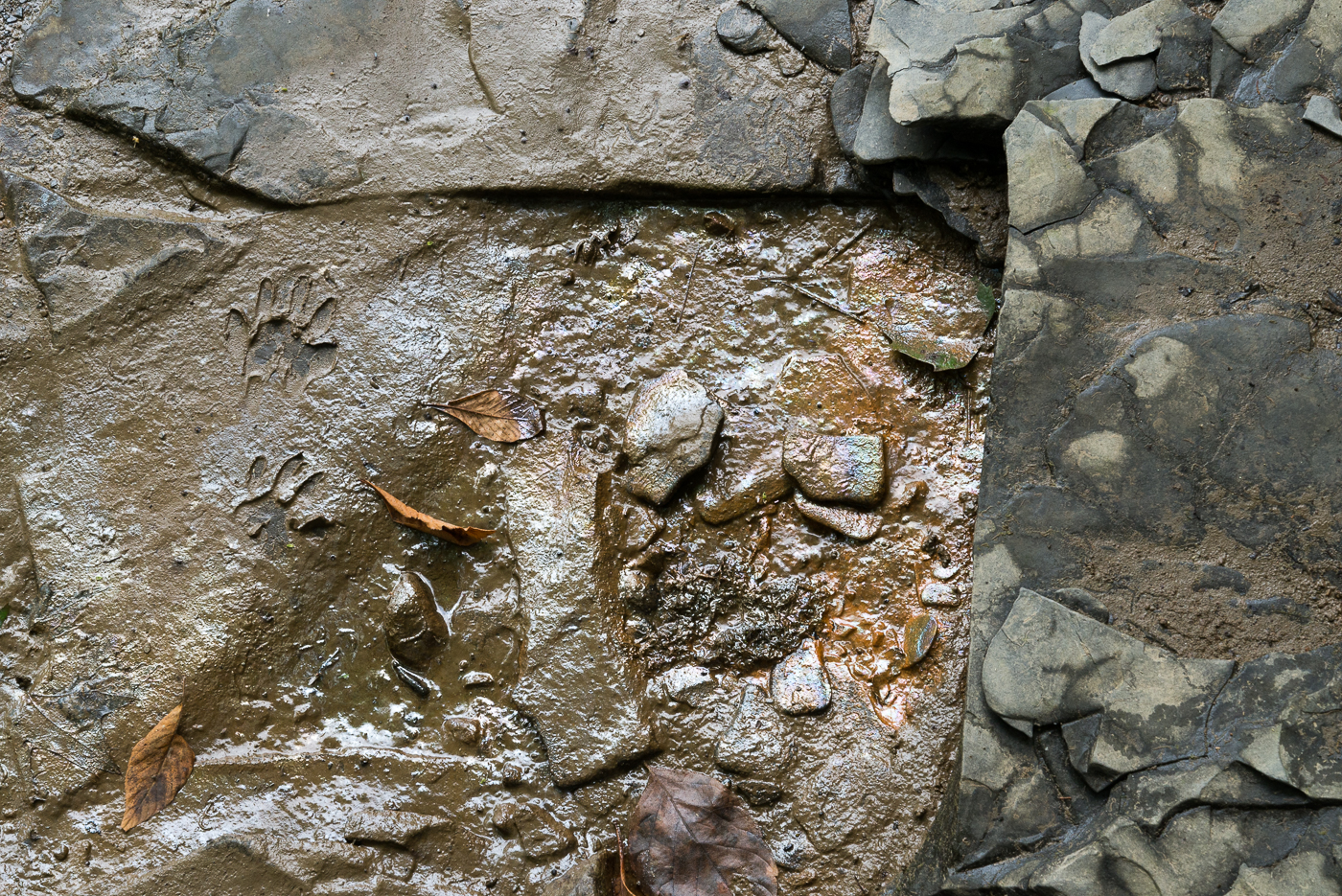 When the water level recedes, it leaves traces of the Leptothrix discophora film on the rocks and mud. The close crop shows the iridescence best. Click on it to see the image even bigger. (The paw prints are from a raccoon.)