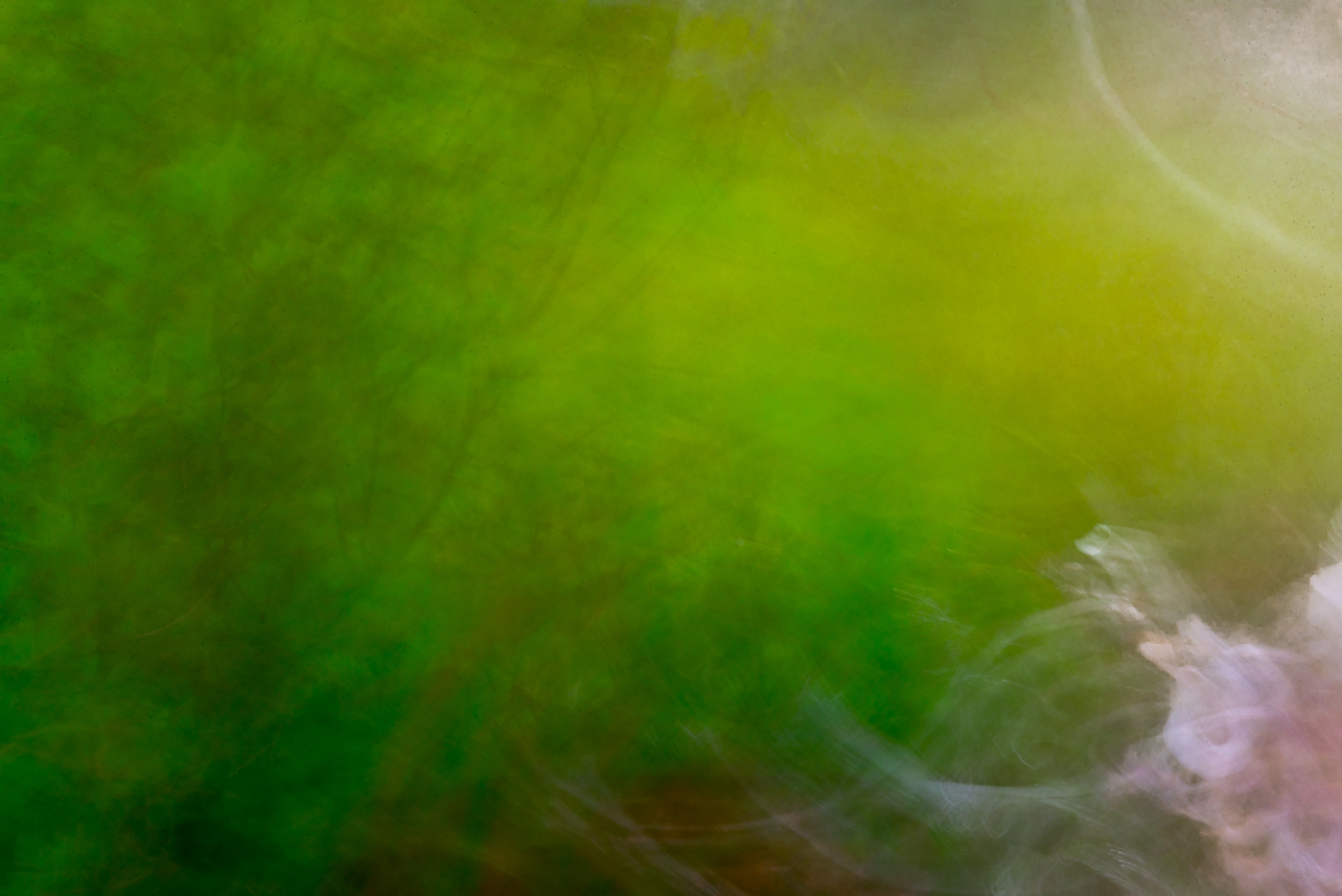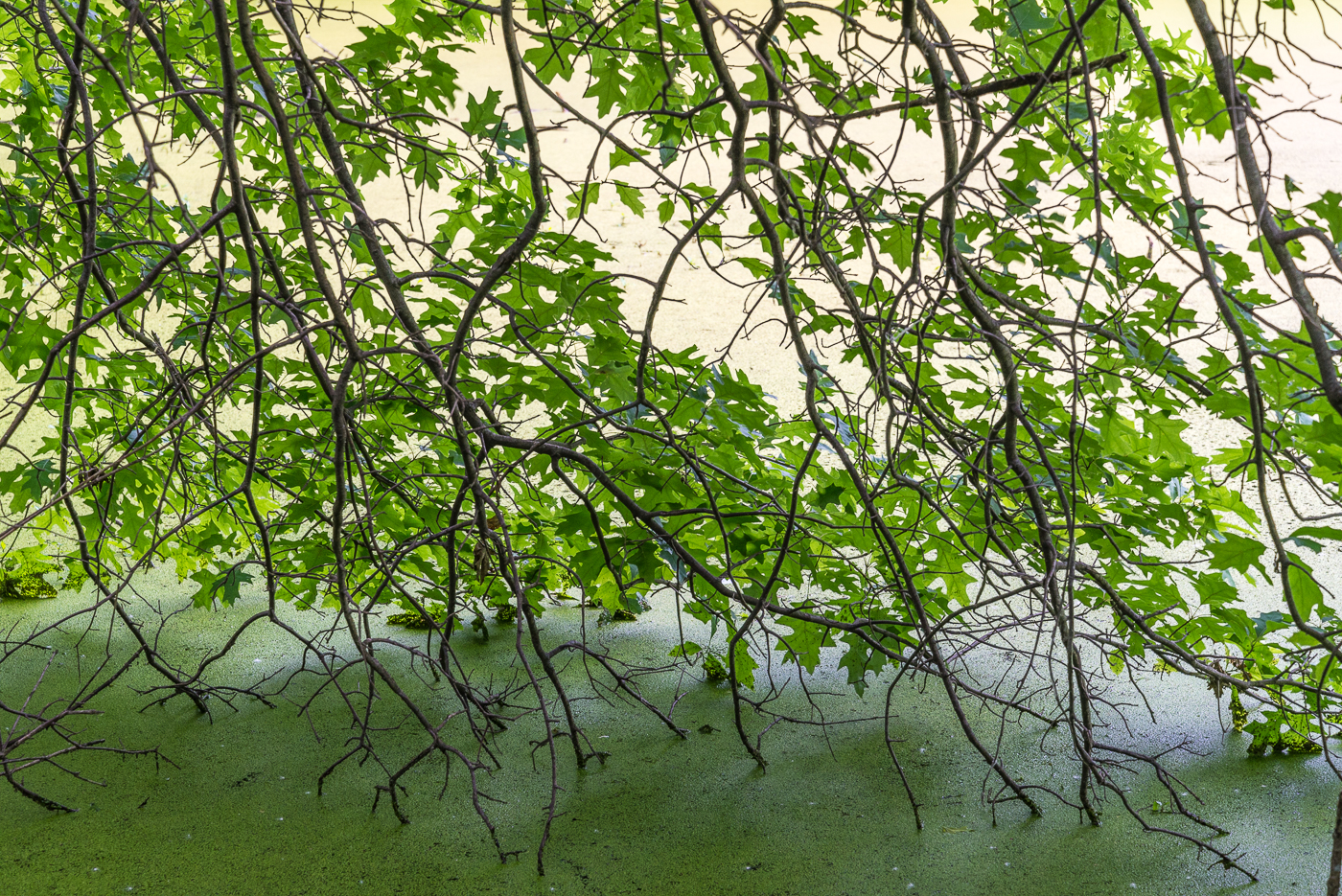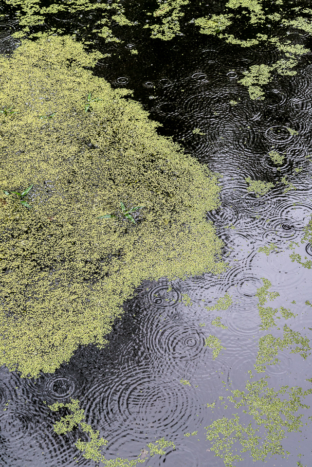 Yesterday I followed and unfollowed paths around my immediate neighborhood. I found baby oak leaves overlooking tall grasses; a willow tree behind goldenrod plants and before cattails sprinkled with pseudacris; a path through a wooded area dotted with daisies; very young films of Leptothrix discophora, some in front of a small outcrop of sedge; a duckweed-covered pond rising to meet hanging branches of another oak tree; and more duckweed in a different pond in the rain. I also took another stab at Intentional Camera Movement.