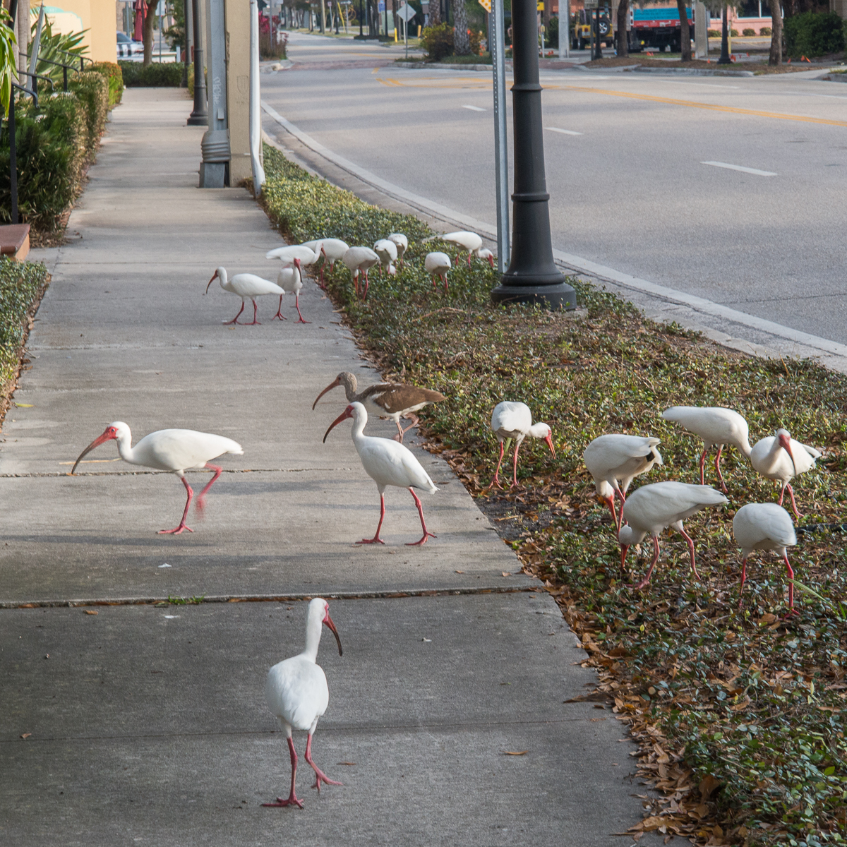 Usually, when the ibises come to town, I only see them from a moving car and without my camera. Saturday they were walking around right in front of me as I made my way to farmers market, camera around my neck. What a treat. I was able to get pretty close to them; they only scattered when a loud truck approached.