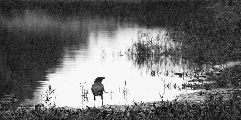 This past Sunday Janet and I attended a fundraiser at the Myakka River State Park for the Friends of Myakka River. We didn’t spend much time taking photos, and I didn’t think I’d gotten anything worth sharing. I didn’t even download until days later. But today I took a good look at them and found some you might enjoy. Or not. This should be my last alligator photo. Should be but probably won’t be. They really are fascinating. It’s partly that they are so big, and—probably—partly that they are so dangerous. For the last year or so Janet has been making a lot of black and white photographs. I used to shoot black and white in the ’70s but haven’t made black and white photos lately. I just seem to see in color. Seeing so many of Janet’s great black and white photos, I finally I had to try some. The first of them here is an anhinga drying out its wings. Unless it’s a cormorant drying out its wings. The anhingas have a sharper bill and silver on their wings, but I can’t tell from this far away. The second is a crow, probably a fish crow. Fish crows look very much like regular crows, but their voices sound like they have put a mute over their mouths. I just read today, in Kevin Kelly’s What Technology Wants, that crows’ forebrains “are as relatively large as those of nonhuman apes, and the ratio of the brain weight to body weight is in the same line as apes.” He calls them, along with parrots and ravens, the “‘primates’ of birds.”