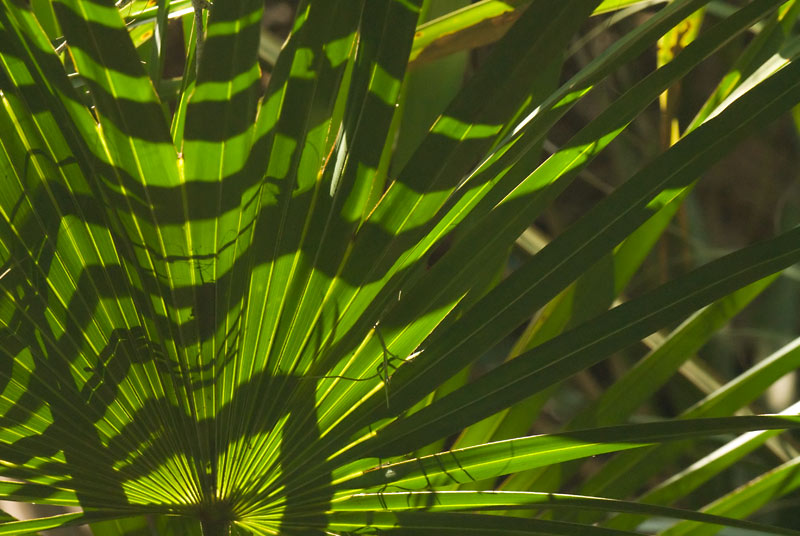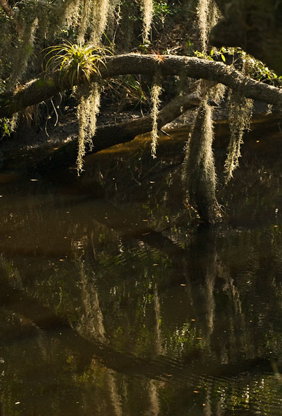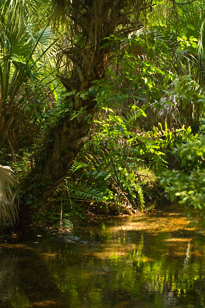 Another new place today: Jelks Preserve, south of Sarasota near Venice. Almost as soon as we walked through the gate Janet noticed a small path to the left. It bordered a small stream on its way to the Myakka River. The foliage was jungle lush, as you can see in the first photograph. I felt like I was in a museum diorama of early plant life. . . . Much later we came to a spot where the wild irises were just finishing blooming. . . . I never can resist an interesting saw palmetto leaf . . . or reflections in water . . . or Leptothrix discophora films.