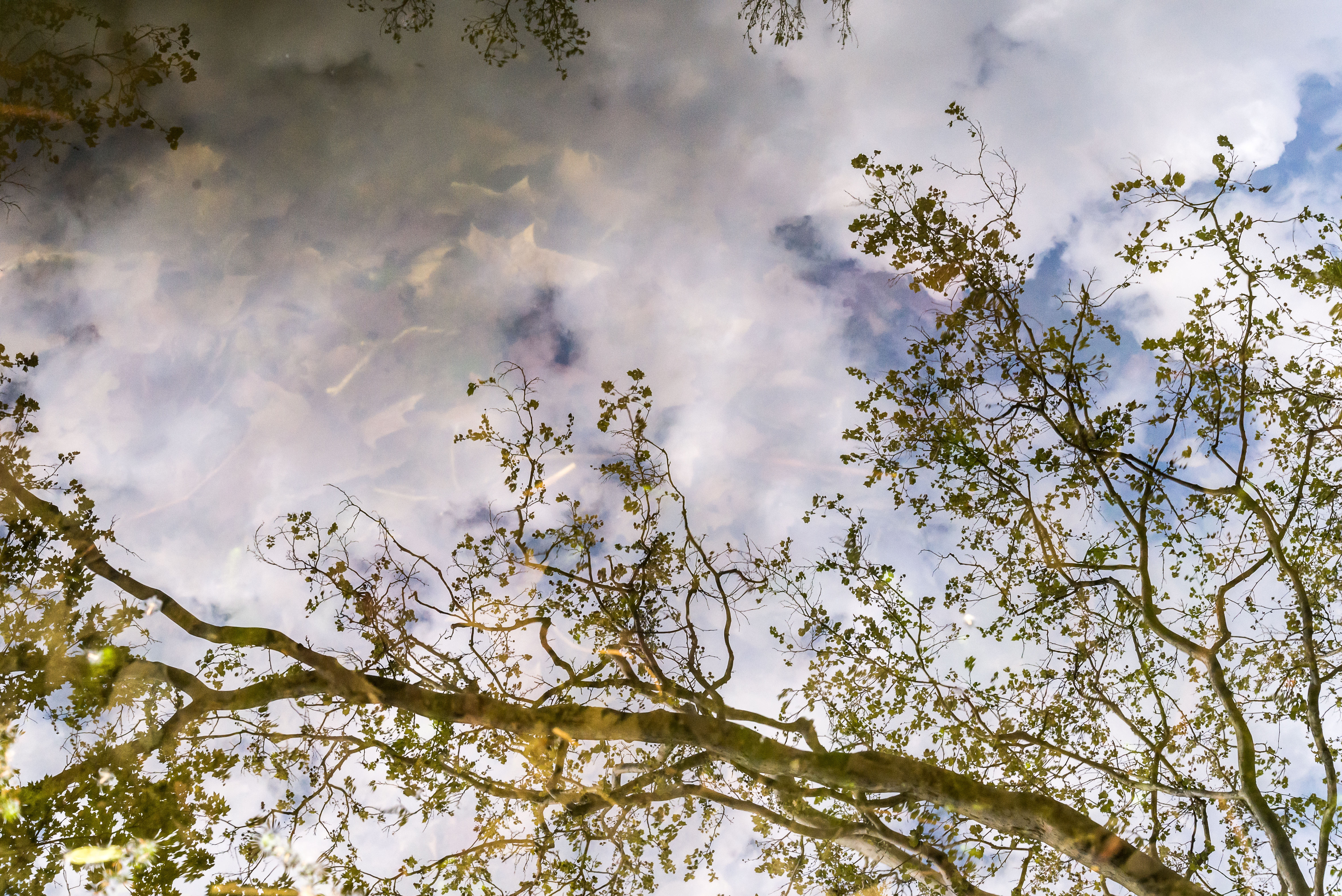 What looks like what might be a double exposure is the reflection of the sky and a sycamore tree overhanging the Back Pond at Schoepfle Garden. Underwater leaves of the past fall add to the mystery.