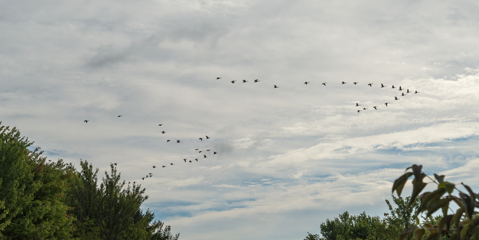 Another sign that fall is approaching is the pretend migration of this area’s Canada geese. Their raucous honking and v-shaped flight patterns are all for show (or something). They never leave but spend the winters here.