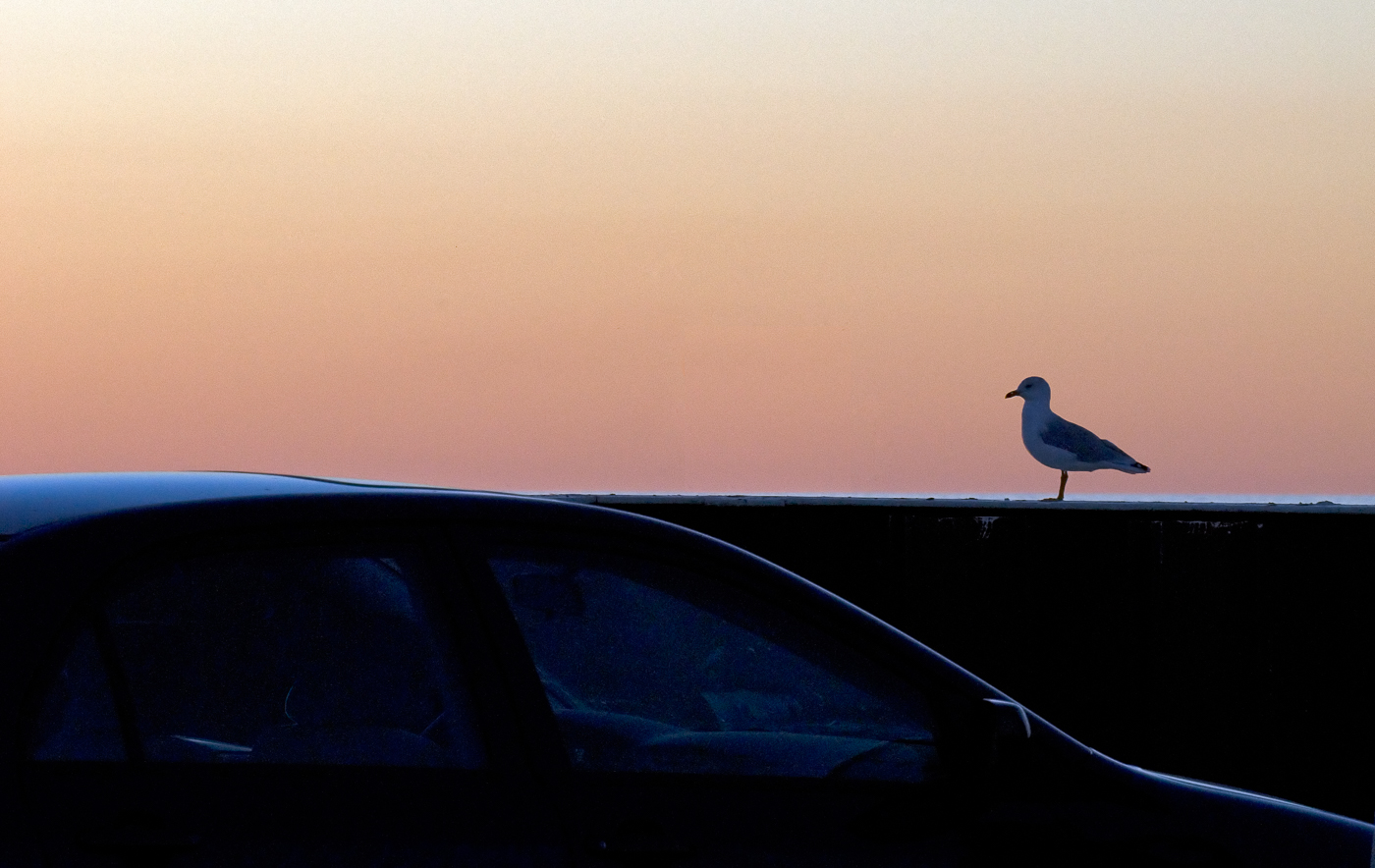 11 As evening falls on the ferry to Port Clinton from South Bass Island, the sun picks out the edges of a car and lights the backdrop for a gull.