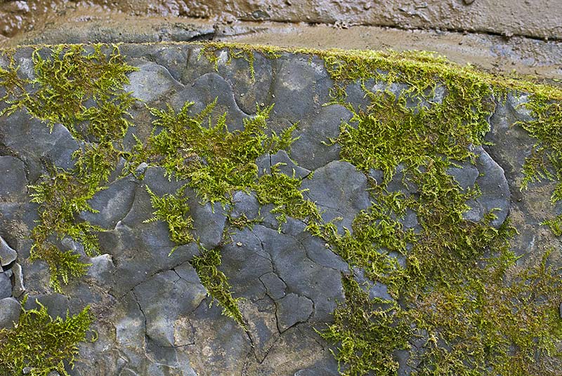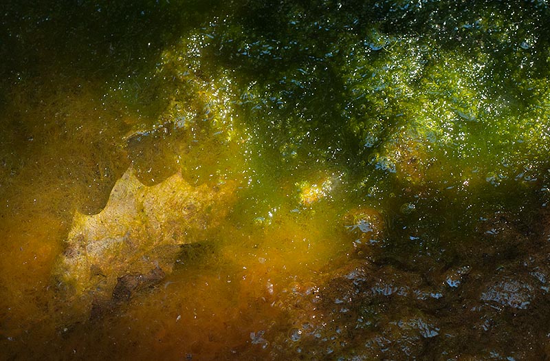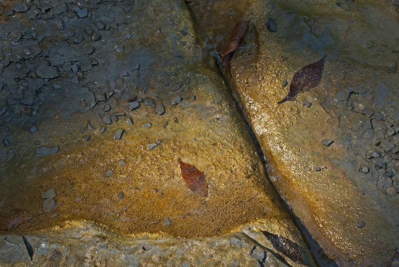 Saturday was another day of sunshine and low water in the river. We’ve had enough rain lately that many of the rocks along the river have sprouted moss. Algae are more prevalent, too. And still—I assume because we’ve also had extended days of heat and sunshine—the iron bacteria have been visibly at work. Trees or their shadows overhang the shore on the “other” side of the river, where I took these photographs. So in the second photograph you see a lot of shade with the sun barely illuminating an area of wet shale covered with algae. The rust colors are the result of the bacteria having deposited iron oxide on the shale and algae. What you see in the third photo is what happens when a shaft of sunlight strikes a leaf (sycamore?) in a few inches of water populated by algae (and probably cyanobacteria, the dark blue-green color), some of which has been layered with iron oxide by the iron bacteria.