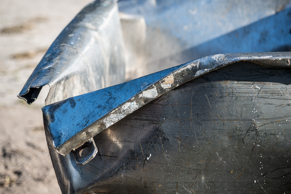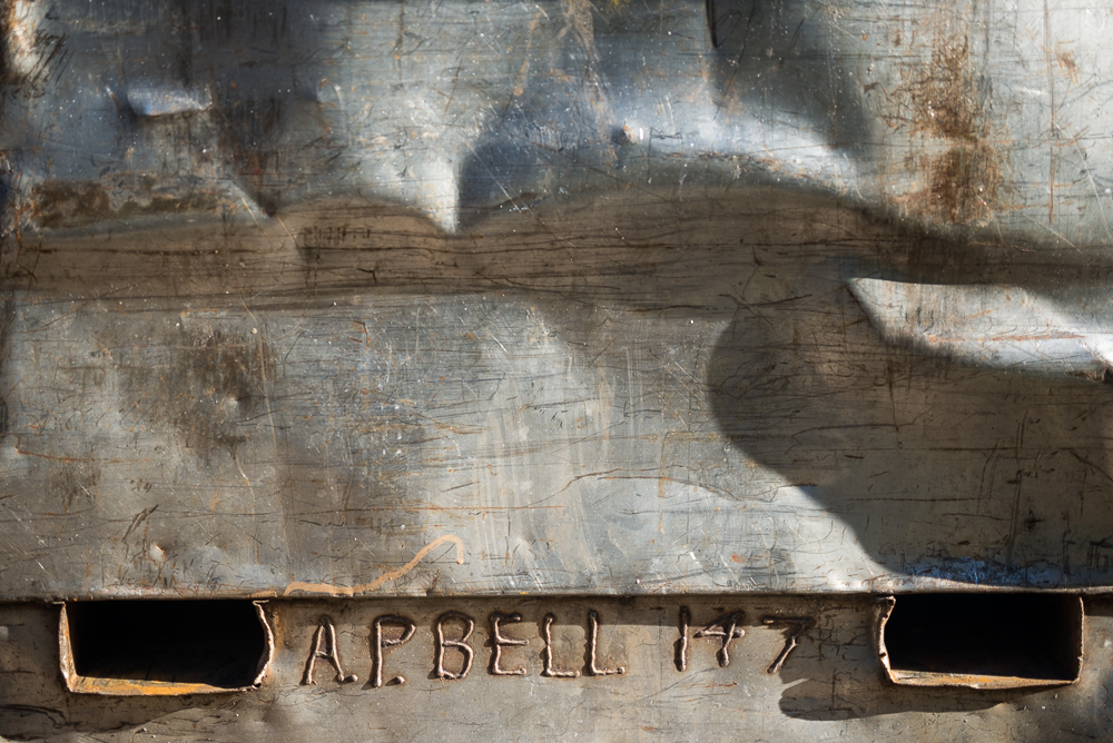 The last time Janet and I went to Cortez (December 8) I fell in love with this metal tub. There are a lot of tubs like this around the docks. I think the fishing boats offload their catch into them. This one was pretty beat up, though, and was being used as a dumpster. I photographed it from all sides and all angles, becoming more and more enamored with the patina, the reflections of blue sky, the scuff and paint marks on it, its dings and rough edges. I didn’t see the dog in back of me until he came around the side. I don’t think much of his opinion.