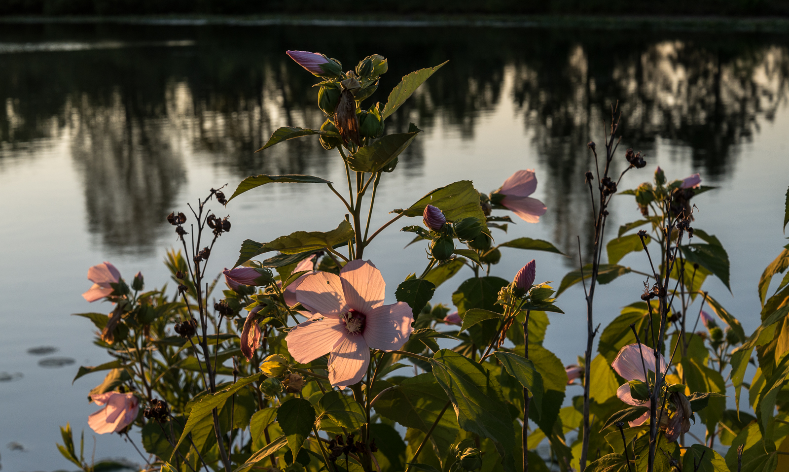 Made another foray to Rock Pond and Wildflower Hill early Monday evening. These are Marsh Mallows (Althaea officinalis) growing around the rim of the pond. And, yes, they are related to the marshmallows that you roast over a campfire. To quote Wikipedia: “A confection made from the root since ancient Egyptian time evolved into today’s marshmallow treat.” The second photo is a detail of the first.