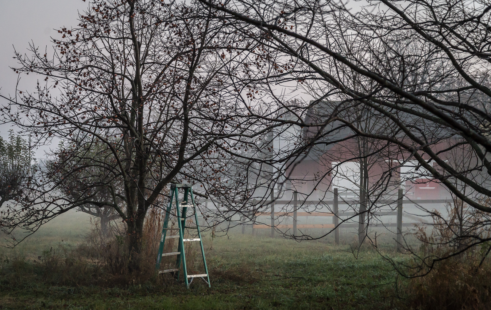 One of my husband’s persimmon trees and a ladder upstage the next-door neighbor’s barn. David and his partners at Vermilion Valley Vineyards make persimmon wine from the fruit of his prolific trees.