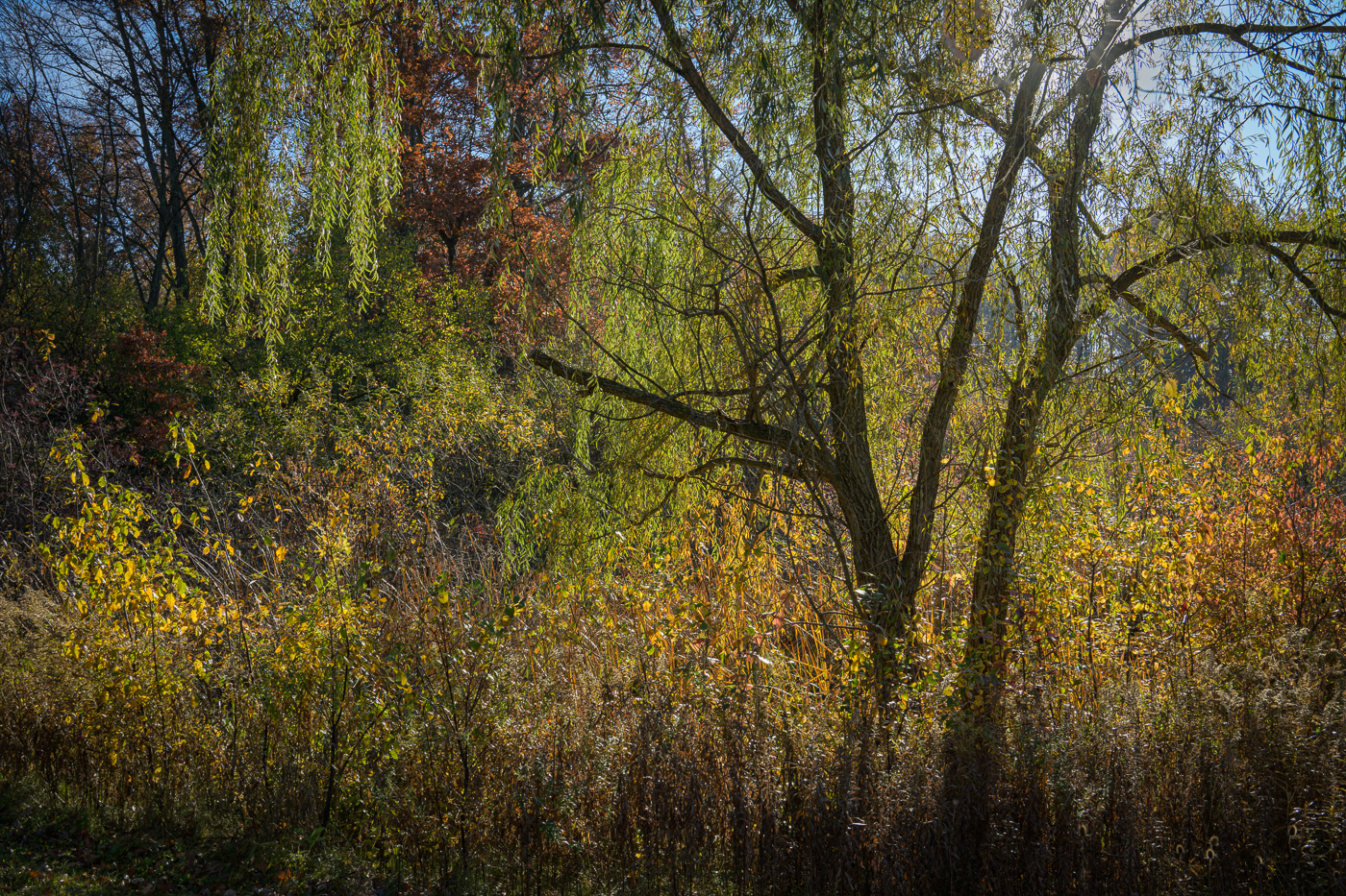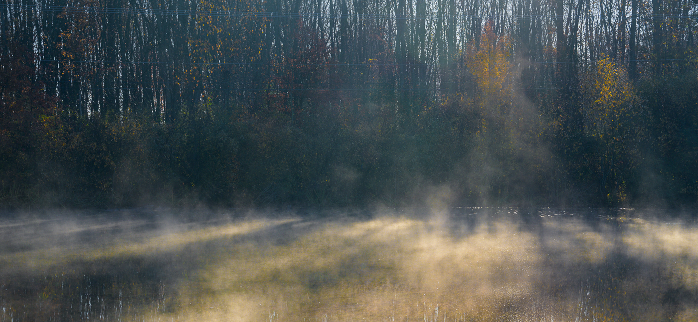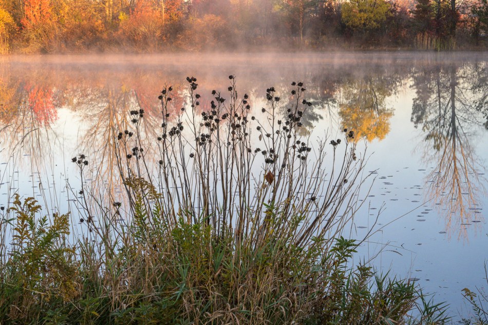 Having put the first load of laundry in the washing machine, I was about to start my morning exercises a week ago Saturday when I happened to look out the window. From our place we can usually see a sliver of Rock Pond. But Rock Pond was not visible. What was visible was a great cloud of mist. Okay, forget the laundry, forget the exercises, grab the camera. The mist had diminished quite a bit by the time I got there, but there was enough to make an interesting photograph. And oh why go back home now that I was out with the camera and the sun was shining so nicely. Might as well see what else the neighborhood had to offer; laundry and exercise could wait. The second and third photographs in this post are from an afternoon foray of a few days earlier. All the rest are from that Saturday of mist and frost and sunshine.