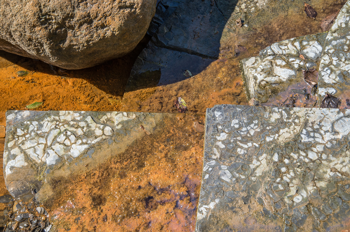 The Yellow Boy story (see previous post) is not all bad, though. Some companies are addressing the problem by reclaiming the iron oxide with a process known as bioremediation The process cleans the site and gives the company or affiliated companies a substance that they then sell as pigment for concrete pavers and other applications. . . . The boulder sitting atop the shale in this photograph is granite, a glacial erratic brought down from Thunder Bay or points north by the last glacier in this area.