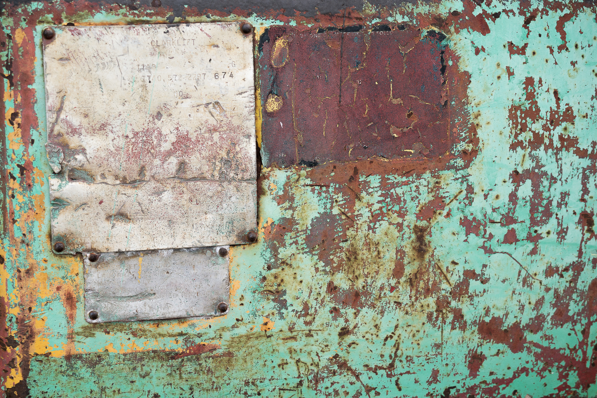 The rowboat’s next-door neighbor is a long-retired forklift, or, as the top left metal plate here proclaims, a Clarklift. I can’t imagine what people thought if they saw Janet and me all over this dear old thing. Or maybe I can. Let’s not think about it.