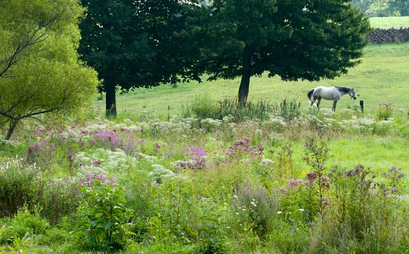 I walked down to the river yesterday for the first time in weeks. My first reward was the colorful leaves of the Wyoming Canna Lily in Schoepfle Garden proper. I shoot these plants every year, but find them just as fascinating every time. . . . Shale rocks next to or in the river are another subject that never fails to draw my attention, especially when water from rain or dew emphasizes the fractured surface. . . . Just when I had almost given up hope of seeing my favorite microbe, I came across a small patch, about four inches in diameter, of Leptothrix discophora. . . . Nearing home on the walk back, I passed our neighbor’s farm and was attracted by the three shades of pinkish wildflowers growing together in their horse pasture. The horse was a bonus. The three pinkish flowers are the invasive Purple Loosestrife (Lythrum salicaria)—that’s the brightest one—and two natives, Spotted Joe-pye Weed (Eutrochium maculatum)—the paler pink—and Tall Ironweed (Vernonia altissima)—the purplish one. I’ve wondered what or who gave Joe-pye Weed its name, and read on the web today that legend says a Colonial New England herb doctor named Joe Pye, who some say was a Native American, was skillful in treating a variety of ailments with potions he created from wild plants. He often used a group of closely related late-summer wildflowers to treat diarrhea, kidney stones, and fever, becoming famous when he stopped a typhus epidemic using his Joe-pye Weeds. . . . Googling Canna Lily, I read that this plant has been cultivated as a food crop for more than 4000 years in its native range in Central and South America. Also: