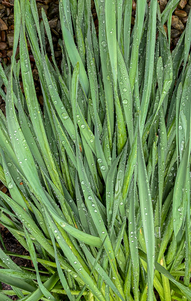15 Iris leaves lie down after a spring rain.